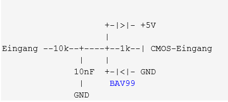 Prinzipiell muß man damit rechnen, das der Nutzer da von Kurzschluß bis ESD-Pulse alles auf die Pins gibt. Von Kurzschluß bis etwas über Vcc begrenzt der erwähnte 220Ohm Widerstand den Strom auf gesunde Werte (bei 5V bleiben ca. 20mA übrig). Je nach Einsatzzweck kann man folgende Verfahren verwenden: - Optokoppler (i.d.R. relativ langsam) - line driver (z.B. ein Hex-Buffer mit parallel geschalteten Ein- und Ausgängen) - Opamp als ADC-Treiber - Tiefpass (wie vom Threadstarter vorgesehen) dimensioniert auf die benötigte Bandbreite - Schutz- bzw. ESD-Dioden Kritisch wird es immer bei hohen Spannungen, hohen Strömen und schnellen Signalen :-) Bidirektional braucht einen schaltbaren Treiber und einen extra Pin, damit man den Treiber hochohmig schalten kann.