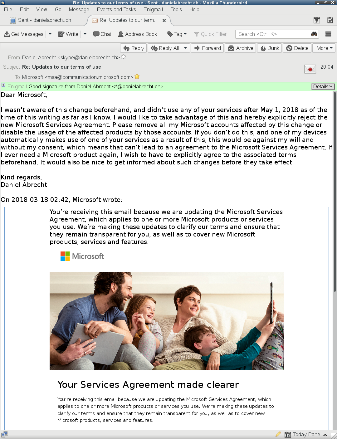 Ups, hatte nicht richtig hingesehen und hatte mai und märz (mar) verwechselt... Naja, egal, die Gelegenheit das Abzulehnen bekommt man so schnell nicht mehr, und es nimmt mich einfach wunder, was MS dann tut. Ich brauche deren Dienste ja nicht.