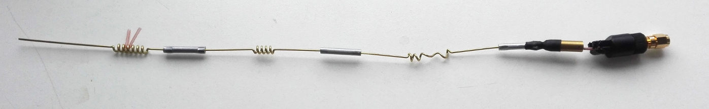 Alex D. schrieb: > Ich hoffe demnächst auf deine test Ergebnisse;-) die du demnächst > kriegst ist die mit dem dünnen Kabel Hier sind sie. Vorab: dein Kabel habe ich ignoriert, ich habe die Antenne nur mit einem RPSMA-SMA-Adapter an die Messgeräte gehängt. Im ersten Bild sieht man die „ausgezogene“ Antenne. Rechts gleich neben dem Stecker ein Sperrtopf zur Anpassung, danach vier aktive Segmente, durch Phasenschieberspulen getrennt. Die unteren drei Segmente bestehen dabei jeweils aus einem eingepressten dickeren Aluminiumstab, das letzte Segment ist nur Draht. Die erste Spule sah bereits so seltsam verbogen aus, das ist nicht durchs Öffnen entstanden. (Ich hatte die Hülle unten oberhalb des Sperrtopfs geöffnet und konnte sie hinterher auch wieder drüber schieben.) Ich habe versucht, die Spule danach nochmal „schön“ zu biegen, hat aber an der Anpassung nicht viel geändert. Die Antenne hat eine wunderschöne Resonanzstelle (Marker 1 im Smith-Diagramm) – nur leider bei 2,64 GHz. Der Bereich von 2,4 bis 2,48 GHz (WLAN-Bereich) ist mit den Markern 2 und 3 gezeigt; die Anpassung dort ist gerade so noch tauglich (der türkisfarbene Kreis markiert ein Stehwellenverhältnis von 1:2 bzw. 10 dB Rückflussdämpfung). Die Antennensammlung zeigt die Vergleichsantennen, gegen die ich gemessen habe. Ganz links die LPDA (logarithmisch-periodische Dipolantenne) für 2-11 GHz fungierte als Sendeantenne am Signalgenerator. Dort habe ich 2450 MHz mit 0 dBm eingespeist. Die anderen Antennen dienten als vergleichende Empfangsantennen am Spekki. Die Dipolantenne benutzen wir kommerziell; ist ein einfacher Dipol mit Sperrtopfanpassung, Hersteller weiß ich gerade nicht. Sollte ganz gut bei den dipol-üblichen 2 dBi Gewinn liegen. Die Yagi ist (wie auch die LPDAs) von WA5VJB; sie sollte so um die 5 dBd bzw. 7 dBi Gewinn haben. Allerdings ist sie eher bei 2,35 GHz resonant. Schließlich die „große“ LPDA, sie müsste um die 3 bis 4 dBd Gewinn (also 5 bis 6 dBi) haben. „DUT“ ist das „Device under Test“, also die zu messende Antenne. Die Ergebnisse unterscheiden sich ziemlich krass je nach Orientierung der Antennen. Offenbar hat die Umgebung insgesamt einigen Einfluss auf die Messung. (Das ist aber nicht abhängig von der oben genannten metallischen Unterlage. Eine solche braucht diese Antenne nicht, und probeweises Anbringen einer solche änderte nichts.) Zuerst habe ich alle Antennen horizontal polarisiert betrieben, da das an den Messgeräten natürlich die Vorzugsvariante ist. Danach habe ich alle auf vertikal gedreht; die beiden knickbaren Antennen nach oben geknickt, die anderen entsprechend an ihren SMA-Steckern gedreht. Die Ergebnisse sind: