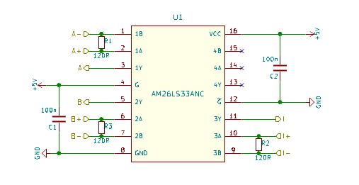 Im Bild AM26LS33.png passt folgendes nicht. - Lastwiderstände 120 Ohm ergäbe einen Strom von 24V/120=0.2A 20mA wäre noch vertretbar - AM26LS33A Low <=0.8V High >=2V jedoch liefert Encoder Low <2V. Also ist nicht garantiert, dass der AM26LS33A ein Low erkennt. - 24V+5% = 25.2V >25V ==> Geringe Speisetoleranz ist bereits kritisch. Der AM26LS33A ist für RS422 und RS485 optimiert. Dort wird Pegeln von 0V und 5V gearbeitet. Also müsste mit Spannungsteilern gegen GND die Eingangspegel auf 5V verringert werden. Die Variante mit dem Optokoppler gefällt mir persönlich am besten. Durch die galvanische Trennung ist der Microcontroller optimal geschützt.