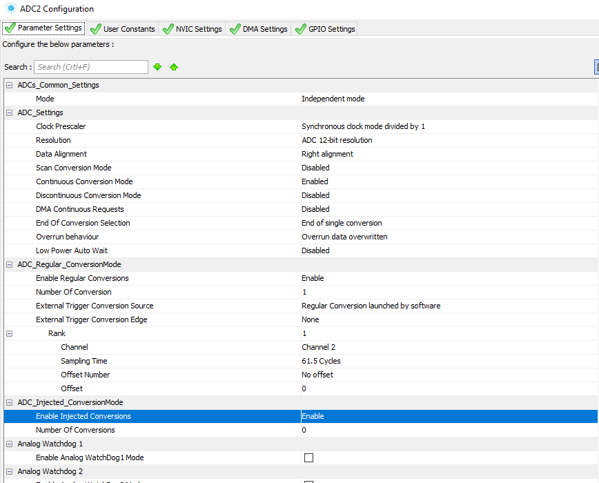 Hi, Ich habe hier einen STM32F303K8 auf einem Board verbaut. Wenn ich den ADC ohne Kalibrierung verwende, funktioniert er gut, doch wenn ich "HAL_ADCEx_Calibration_Start(&hadc2,ADC_SINGLE_ENDED);" beim Aufstarten ausführe, bekomme ich einen Disconnect vom STLINK-V2, wobei dann das Board auch nicht aufstartet. Nun handelt es sich wahrscheinlich um ein Problem bei den Clock Konfigurationen, nur kann ich machen was ich will, das Problem besteht immer. Jemand eine Idee, was da falsch Konfiguriert ist? Hier ist z.B ein ähnlicher Fall, doch die Lösung nicht genau beschrieben: https://stackoverflow.com/questions/43876460/stm32f303-adc-gets-stuck-in-the-calibration Edit: Wenn ich den Clock Prescaler auf /4 setze, dann funktioniert die Kalibrierung. Grüsse Bert