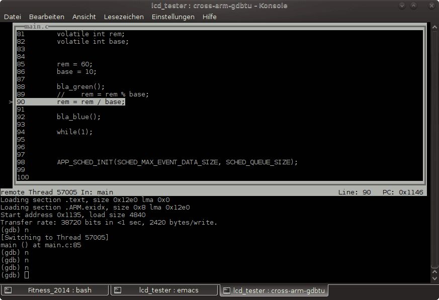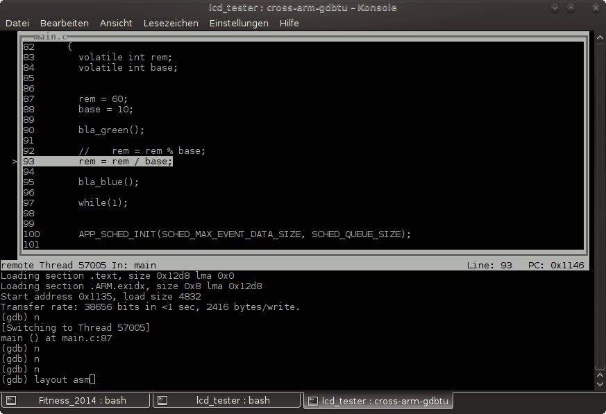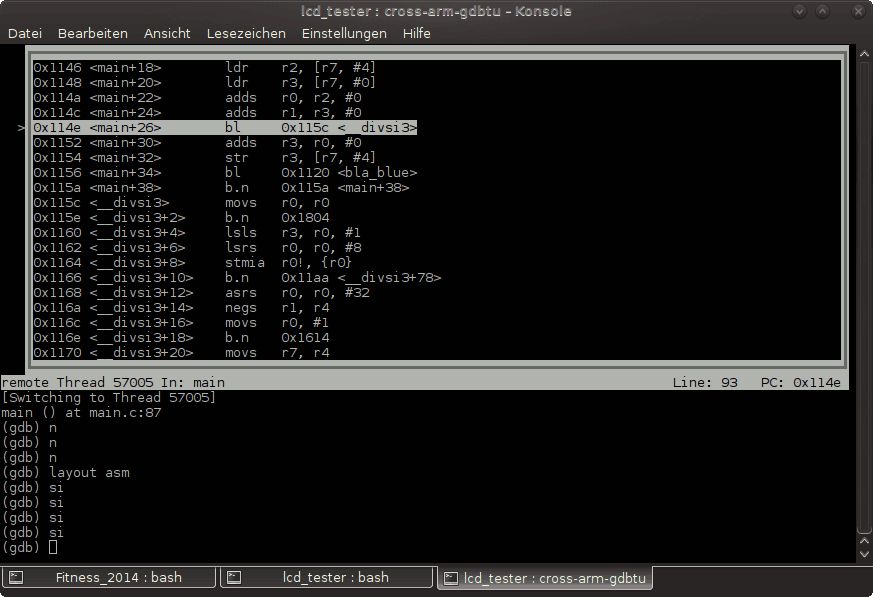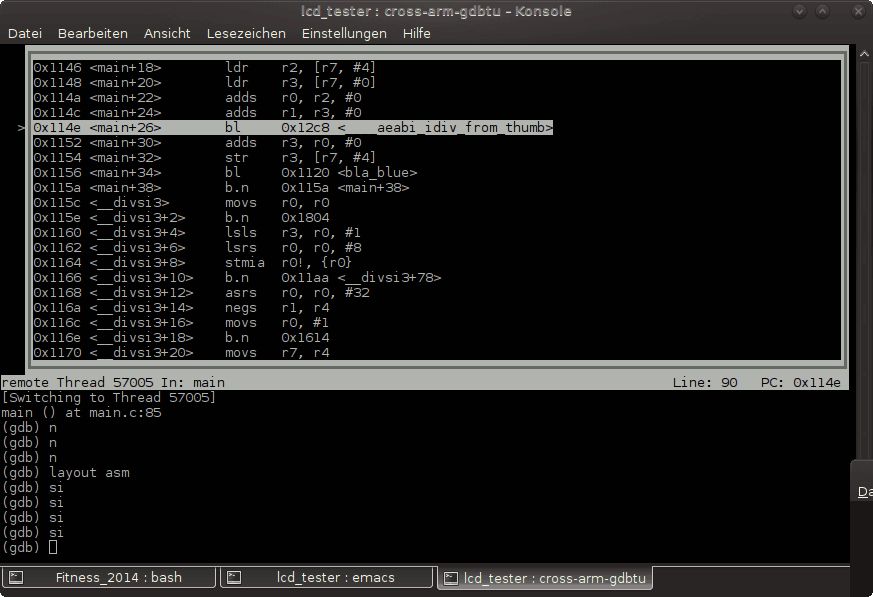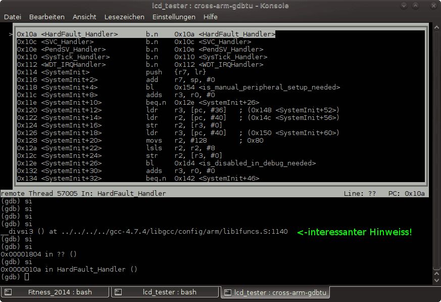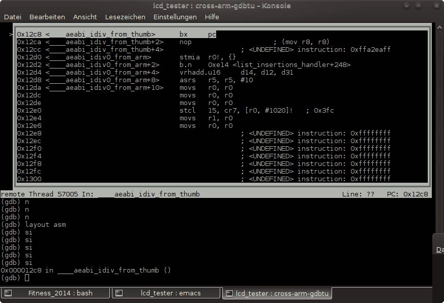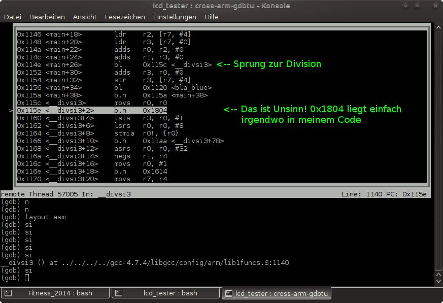 Ich hab gerade nochmal kontrolliert das der Compiler wirklich die richtige libgcc.o reinpackt und das dies auch wirklich eine beim letzten compilieren neu erzeugte Version ist. Alles korrekt. Dann hab ich die Libary mal ausgepackt und mir den Assemblercode angeschaut: _divsi3.o: file format elf32-littlearm Disassembly of section .text: 00000000 <__divsi3>: 0: e3510000 cmp r1, #0 4: 0a000043 beq 118 <.divsi3_skip_div0_test+0x110> 00000008 <.divsi3_skip_div0_test>: 8: e020c001 eor ip, r0, r1 c: 42611000 rsbmi r1, r1, #0 [..] Das sieht gut und richtig aus. Ehrlich gesagt jetzt bin ich ratlos. Schaut man sich jetzt mal die Bytes im Debugger an: (gdb) x 0x115c 0x115c <__divsi3>: 0xe3510000 (gdb) x 0x115e 0x115e <__divsi3+2>: 0x0043e351 Sieht das gut aus. Aber wie kann es sein das der Debugger daraus... 0x115c <__divsi3> movs r0, r0 0x115e <__divsi3+2> b.n 0x1804 ..macht. movs und cmp sind doch total unterschiedliche Befehle! Und auch der Sprungbefehl im Debugger ist ganz anders. Olaf