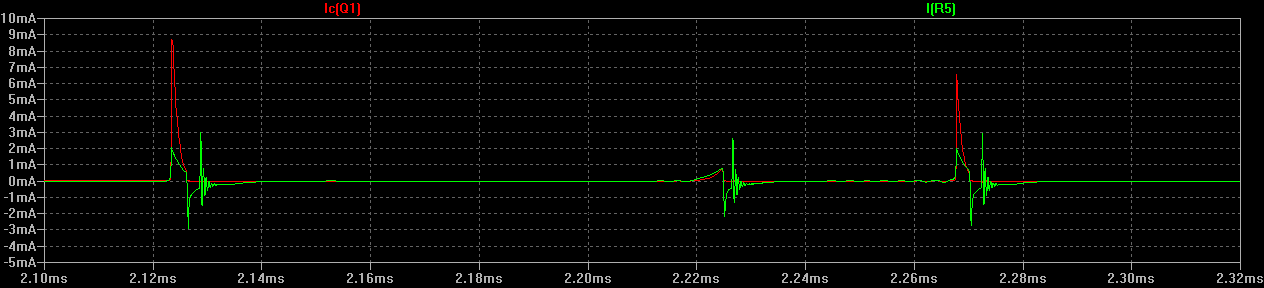 Johann R. schrieb: > kann man das Abschalten mit Kondensatoren irgendwie beschleunigen? Widerstand parallel zu B-E, oder Sättigung verhindern -> Schottky-Transistor. Johann R. schrieb: >> Außerdem entstehen am Kollektor Q2 Sprünge von 12V, die durch R5 Ströme >> von fast 5mA erzeugen (natürlich immer nur kurz, aber so kommt was >> zusammen), und natürlich fließen durch R1 auch immer fast 10mA. > > Simulation besagt was anderes. Siehe Bild Du meinst 9mA ist nicht das gleiche wie fast 10mA? Oder dass die nicht "immer" fließen? Ich meinte natürlich auch nicht, dass die 10mA dauerhaft fließen, sondern nur an der Einschaltflanke! Das ist doch aus der Schaltungsfunktion klar.