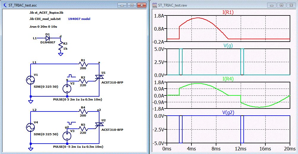 > Bei meiner Schaltung aber bleibt sie nach paar ms hängen, denn der Gate Strom schwingt irre. Das wundert mich auch nicht. 1. Du musst zwischen G und K ansteuern und nicht zwischen G und A. 2. Außerdem musst du jetzt das TRIAC Symbol aus [Misc] nehmen, wenn du meine angehängte Modell-Datei nimmst.7Nimm die 1N4007. 3. 1N4148 haben in so einer Schaltung auch nichts verloren. Die halten keine 325V aus.