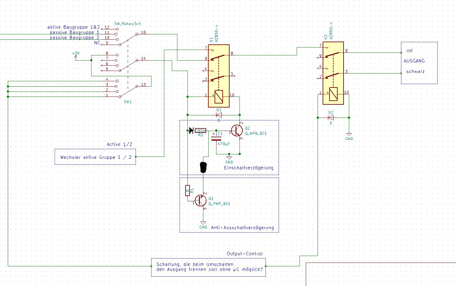 Nachdem ich mir nun nochmal einige Gedanken zum Aufbau gemacht habe, denke ich, dass einige meiner letzten Problemchen mit zwangsgeführten Relais (z.B. Finder 50er-Serie) und einer Einschaltverzögerung gelöst werden können. Beim bewegen des Drehschalters würde ich dennoch gerne den Ausgang trennen. Im Anhang hab ich mal nen Schaltplan gezeichnet. Beim Umschalten der passiven Baugruppe 1 zur aktiven Baugruppe 1&2 hätte ich gerne eine Verzögerung im durchschaltenden Relay, damit ein zweites Relay in der Zwischenzeit getrennt werden kann. Schalte ich nun zurück von der aktiven Baugruppe, darf kein Delay vorhanden sein. Daher wäre meine Idee ein PNP-Transistor, um die gespeicherte Energie vom Kondensator zu entladen. Scheinbar gibt es schon Leute, die die Einschaltverzögerung auf diese/ähnliche Art gelöst haben, aber ich habe noch keine Formel gefunden, wie ich mir die Verzögerung nun berechnen kann. Würde das denn so Sinn machen oder brauch ich das gar nicht erst aufm Steckbrett zu testen? Weiterhin überlege ich, ob es mit einer diskreten Schaltung einfach zu realisieren wäre bei jedem Umschaltvorgang den Ausgang erstmal zu sperren und auf bestätigung wieder freizugeben. Sollte das zu komplex werden, werde ich das evtl. durch einen Mikrokontroller lösen. Durch die Einschaltverzögerung erhoffe ich mir genug Zeit dafür ;)
