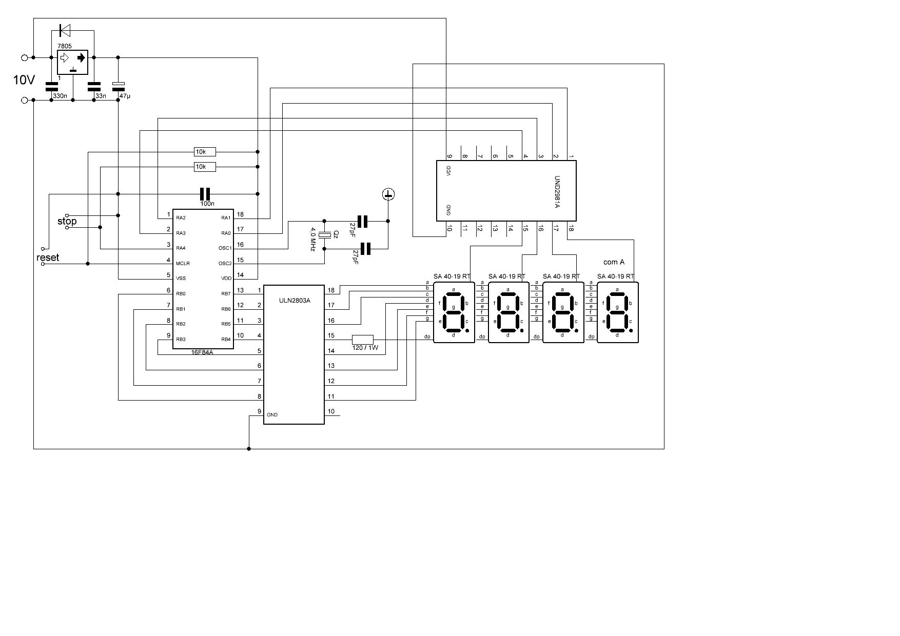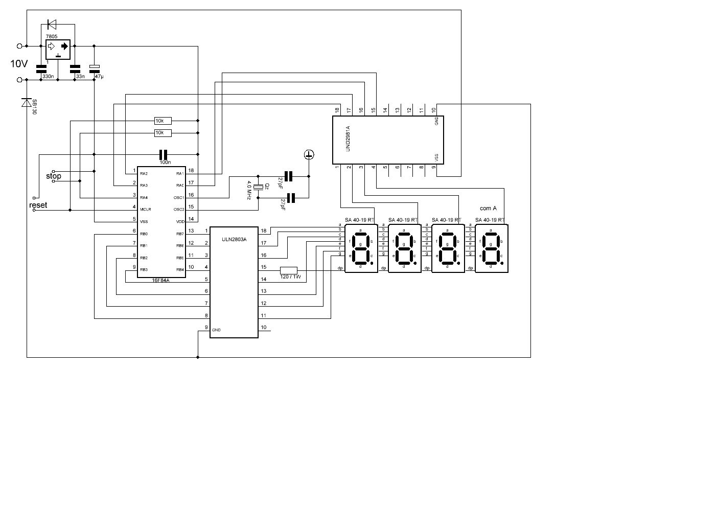 Ich hab die Schaltung mit einem einfachen Programm, mit dem selben Pic getestet. Also Multiplexing mit einfacher Zeitschleife, Ansteuerung jeder einzelnen Anzeige etc. alles funktioniert.Habe dann das Programm von Sprut(Stoppuhr) mit meinen Änderungen in der 7-Segment Tabelle (also bit 0 auf 1 gesetzt) und Portregister modifiziert. Ich werde am besten mal meine Änderungen im ASM-Code schicken.