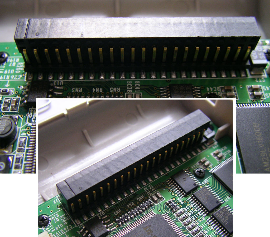 Das könnte eine abgewinkelte Buchse sein - wenn man genau hinsieht, sieht man auch, daß die nicht auf beiden Seiten identisch aussieht (die Metallkontakte gehen auf der dem Platinenrand zugewandten Seite weiter nach oben). Leider ist Bild1 so schlecht ausgeleuchtet, daß man beim besten Willen keine Details erkennen kann. Da müssten eigentlich Löcher im 2mm-Raster sein, die untere Lochreihe schließt unmittelbar an die Oberkante der Metallkontakte an. Meine Vermutung ist, daß der Stecker der Festplatte parallel zur Platine in diese Buchse gesteckt werden muss. So jedenfalls ist das bei einem Festplatten-mp3-Player/Imagetank gelöst, den ich mir vor einiger Zeit mal angeschafft habe, die Buchse darin sieht der hier verdächtig ähnlich.