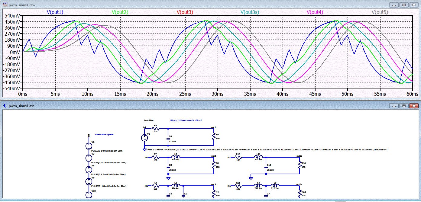 Im Spektrum der PWM sind starke Harmonische der 3. bis zur 13. Frequenz der Grundfrequenz des Sinus. Die Höhe der Harminschen hängt von der Schaltfrequenz ab. In deinem Beispiel ist die Schaltfrequenz nur das 20fache der Grundfrequenz. Falls es um 50Hz geht, dann wäre eine Schaltfrequenz größer gleich 20kHz sinnvoller da dann die Harmonischen niedriger Ordnung viel kleiner wären. Wie gut man filtern muss hängt jetzt auch davon ab wie stark die Oberwellen bei allen erwarteten Lasten sein darf. Ist das jetzt eine Leistungsanwendung z. B. 50Hz und 230V? Im Anhang mal zwei mögliche Quellen und die Wirkung von Filtern. Natürlich hängt die Dimensionierung des Filters von der Lastimpedanz ab. 1. Quelle mit PWL PWL 0 0 REPEAT FOREVER (1u 1 1m 1 1.0002m -1 2m -1 2.0002m 1 8m 1 8.0002m -1 9m -1 9.0002m 1 10m 1 10.0002m -1 11m -1 11.0002m 1 12m 1 12.0002m -1 18m -1 18.0002m 1 19m 1 19.0002m -1 20m -1 20.0002m 1) ENDREPEAT 2. Quelle durch Überlagerung von Pulsen (Serienschaltung). Filter ------- Ab einem Fiter 3. Ordnung sieht das schon brauchbar aus. Falls auf der Eingangsseite geschaltet wird, dann muss man ein Filter mit L am Eingang nehmen. Siehe Filter auf der rechten Hälfte. In deiner Anwendung wird das wahrscheinlich der Fall sein. Filterdesign: https://rf-tools.com/lc-filter/