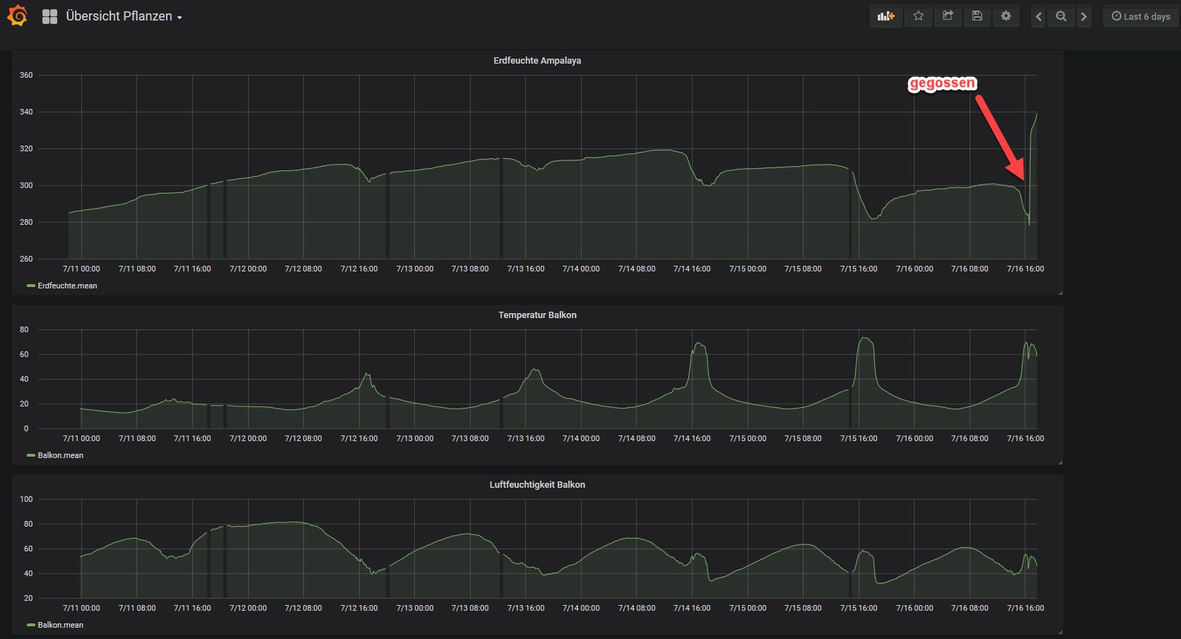 Ich sehe das genauso wie Wolfgang. Und mir geht es darum die Messung in das vorhandene Sensornetz zu integrieren. Jezt war es doch Zeit zu giessen, habe satte 2L gegossen und die Erde ist nass. Der Wert klettert wieder nach dem sprunghaften Anstieg, ich baue jetzt noch einen zweiten Sensor dazu.
