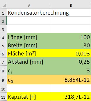 Johannes S. schrieb: > Ein Plattenkondensator mit der > Fläche 30x100 mm² und 2x125µm Folie mit Er=3 dazwischen müsste ca. 320 > pF haben. Oder muss ich die Fläche mal 2 nehmen weil beide Seiten > wirken? Nicht doppelt, stimmt so. auch simuliert passts. Komisch nur, dass Du bei Deinem Buchtest nur ein drittel gemessen hast. OK, PE hat 2,4 nicht drei, aber eben auch nicht 1.
