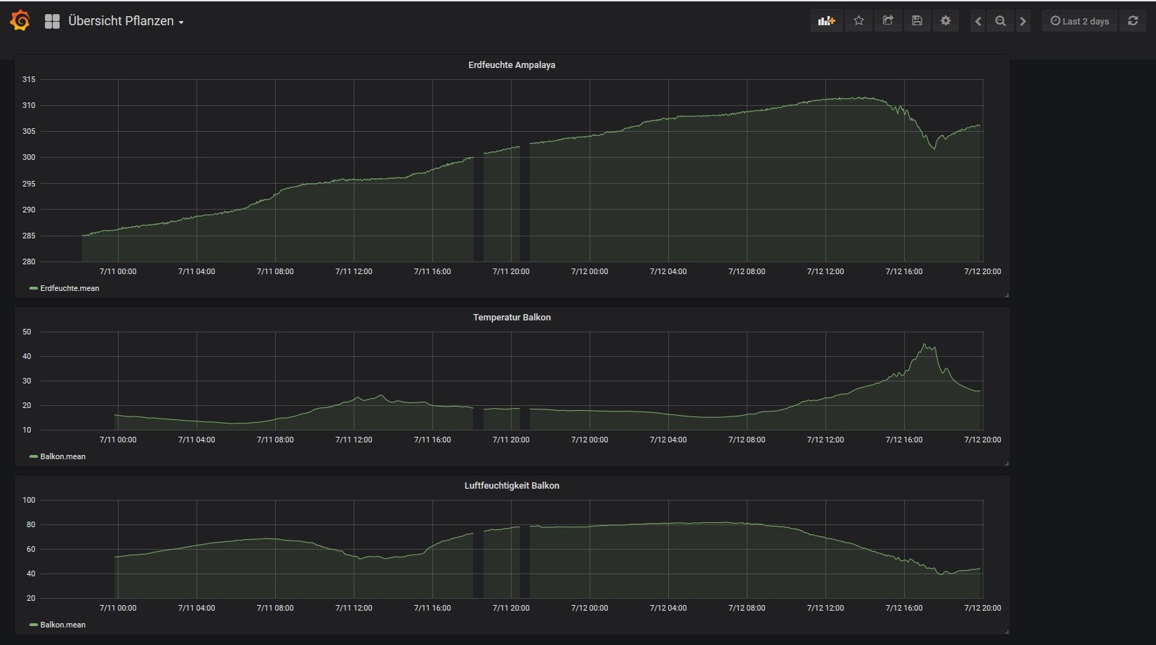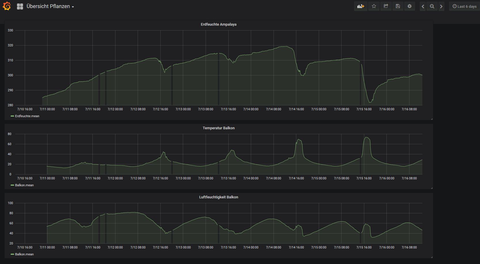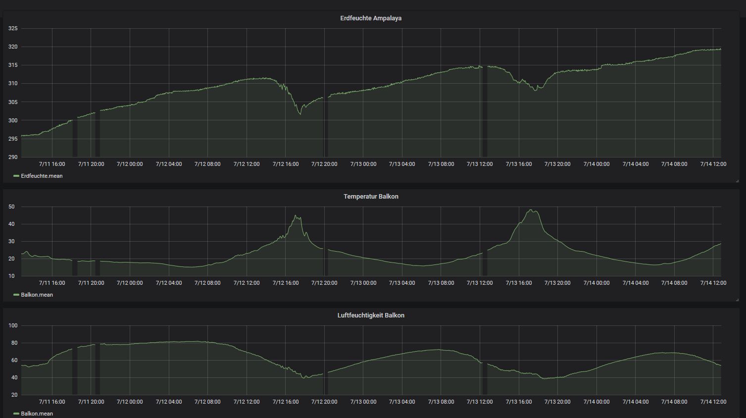 Die kurzen Spitzen in deinen Werten sehen schon komisch aus, könnten da auch Interupts in die Messung reinhauen? Und sind da auch Spitzen in dem Mittelwert? Mein Sensor läuft mit Batterien, dadurch kann ich mir schonmal keine leitungsgebundenen Störungen einfangen. Bei mir trocknet die Erde weiter, von oben nach unten deutlich fühlbar. Mit Markise als Regenschutz, die Pflanze hat nur sehr wenig Regen abbekommen. Ich liefere morgen nochmal ein Bild mit den Messwerten. Der Trend geht weiter so, aber die Erde an der Oberfläche trocknet jetzt bis weiter runter. Weitere Sensoren habe ich noch nicht gebaut, war zu schönes Wetter :-) Die Foliendicke habe ich mit der Mikrometerschraube nachgemessen weil ich auch nicht mehr genau wusste welche Stärke das war, habe zwei verschiedene. Es sind jedenfalls genau 2 x 125 µm. Folienmaterial müsste PE sein, PET ist doch härter? Ich hatte auch nochmal Messwerte von Zentris angesehen, er hat ja seine Grafana Oberfläche online gestellt. Das Trocknen der Erde dauert schon ein paar Tage. So eine starke Temperaturabhängigkeit oder Abhängigkeit von Sonneneinstrahlung hat er auch nicht, ich würde meine Sensoren nochmal etwas tiefer eingraben.