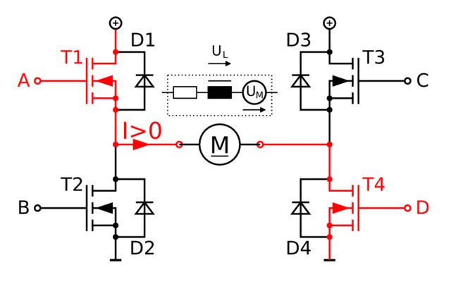Hallo Elektronikfreunde, ich habe eine Frage, die mich schon seit längerem beschäftigt. Ich kenne es von Hoch- und Tiefsetzsteller, dass zur Verlustreduzierung die Diode für den Freilaufkreis durch einen aktiv geschalteten Mosfet überbrückt wird (Aktiver Freilauf). Wenn ich bei der H-Brücke im Bild den Strom über T1 und T4 fließen lasse und den T1 fürs PWM ausschalte, dann fließt der Strom über T4 und D2. Warum darf ich in diesem Fall nicht T2 einschalten? T2 und T4 sind ja der Betriebsfall "bremsen". Dies geschieht doch auch unweigerlich, wenn der Strom über D2 getrieben wird. Was übersehe ich? Viele Grüße Stefan