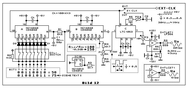 Hallo Seppel, seppel schrieb: > Ich kann im Offtopic leider keinen Beitrag erstellen. > Wie kann man ein Rechtecksignal in einen Sinus umwandeln, so nach dem > Motto harmonic approximation. > Gibt es da eine gute Seite oder vllt. auch gute Bücher? Ich habe dieses Problem vor vielen Jahren gelöst mit einem SC-Tiefpassfilter, dessen Grenzfrequenz mit einem Faktor variabel abhängig ist von der Eingangs-Taktfrequenz. Auf diese Weise werden die Harmonischen bereits ab der ersten f*3 recht gut gedämpft. Wenn Dich das interessiert, musst Du halt leider etwas Zeit zum Lesen investieren. Dazu dieser Link (auch die Linkliste am Schluss ist wichtig zum Verständnis der Switched-Capacitor-Filter [SC-Filter]): "Sinusgeneratoren und der SC-Sinusgenerator" http://www.elektronik-kompendium.de/public/schaerer/scsing.htm Zur Einleitung die Schaltung gleich im Bild. Du musst für Deine Anwendung selber wissen, ob Du diesen Aufwand benötigst. Bestimmt dann nicht, wenn fixe Sinusfrequenzen genügen. Gruss Thomas