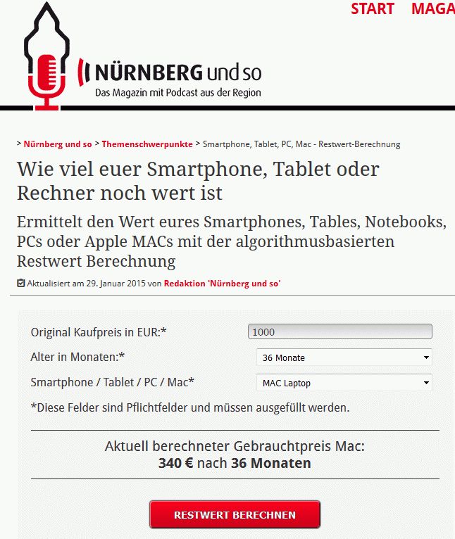 Ja, diese Webseite ist sicherlich die Referenz, die für die Ermittlung von Gebrauchtpreisen von Applehardware herangezogen wird. Anders kann es ja gar nicht sein. -- Alternativvorschlag: Ermittle den Preis, den ein 17"-MacBook Pro vor sieben Jahren gekostet hat, und vergleiche das mit dem, was kommerzielle Gebrauchthändler heute dafür haben wollen: https://asgoodasnew.com/collections/macbook-pro-2011/17 Das sind etwa 25% bis 33% des Neupreises. Kennst Du irgendein Wintel-Notebook, das nach sieben Jahren noch (erfolgreich) für derartige Preise verkauft wird?