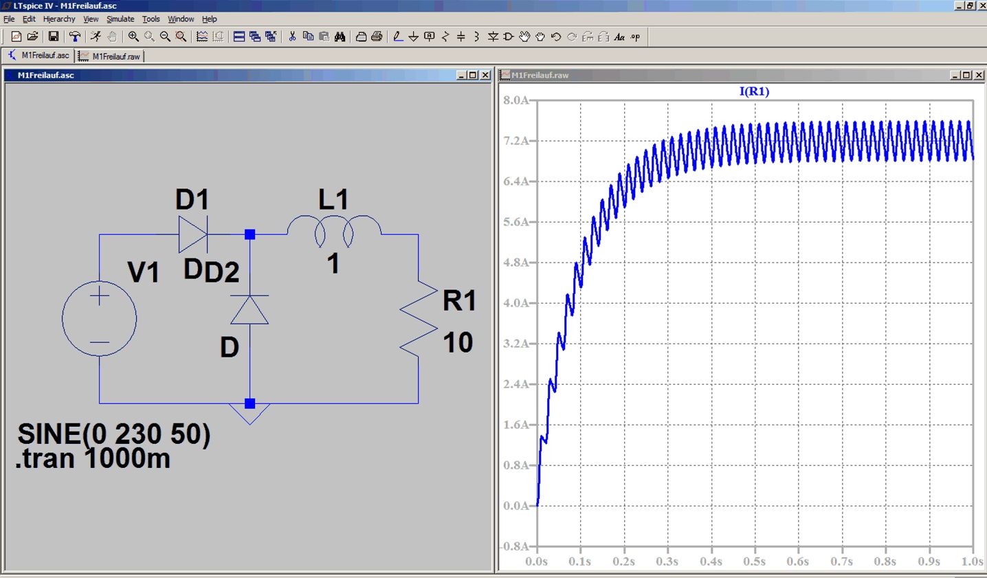 Hallo, ich habe eine einfache Gleichrichterschaltung in LTspice aufgebaut und komme nicht darauf, wieso es zu diesem Laststrom kommt. Solange die Diode nicht leitet, sollte doch das sich langsam abbauende Magnetfeld der Spule, die Zeit überbrücken in der kein Strom fließt, sodass ich dann eine halbwegs korrekte Gleichspannung bekomme.