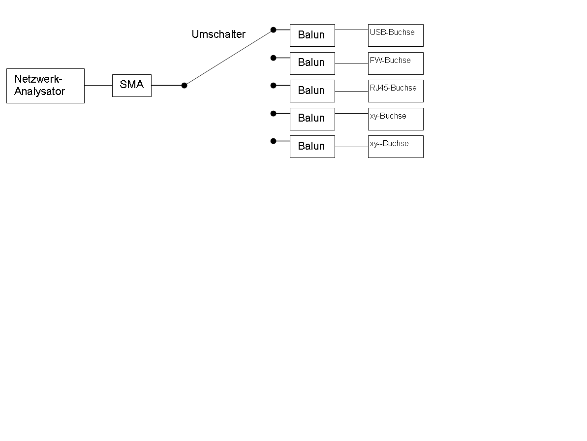 Hier mal eine Skizze, die das ganze (hoffentlich) etwas verständlich macht. Einmal ist z.B. der Zweig 'aktiviert' an dem die USB-Buchse angeschlossen ist und alle restlichen Leitungen sind mit Z0 abgeschlossen. Danach schalte ich (manuell) um, so daß jetzt der Zweig mit der RJ45-Buchse angeschlossen ist, alle anderen Zweige sind jetzt mit Z0 abgeschlossen. Solche Systeme sind kommerziell verfügbar, wobei das Umschalten sogar elektronisch geschieht, nur weiß ich nicht, wie die nicht genutzten Zweige 'automatisch' mit Z0 abgeschlossen werden. Auch in Feldtestern wie dem Agilent Wirescope 350 wird z.B. erst die Reflektion am Paar 1-2 einer RJ45-Buchse gemessen, während alle anderen Paare mit Z0 abgeschlossen sind. Anschließend wird das Paar 3-6 gemessen, alle anderen sind wieder mit Z0 abgeschlossen usw. @Wolfgang: Der Balun nimmt eine Impedanzanpassung von 50 auf 100 Ohm vor, die fast immer bei Datenkabeln als differentielle Impedanz verwendet werden. Korrekterweise müßte aber tatsächlich eine individuelle Impedanzanpassung erfolgen, da USB 90 Ohm und Firewire 110 Ohm benutzt. @Christoph: Ja, hatte an etwas ähnlichem wie den Wilkinson-Teiler gedacht, nur daß das Signal nicht auf 2, sondern mehrere Zweige aufgeteilt wird. Der Frequenzbereich sollte 1 - 100 MHz umfassen, besser 1 - 250 MHz. Verlustbehaftet wird es ohnehin, Wilkinson allseitig angepaßt und verlustfrei geht ja nicht.