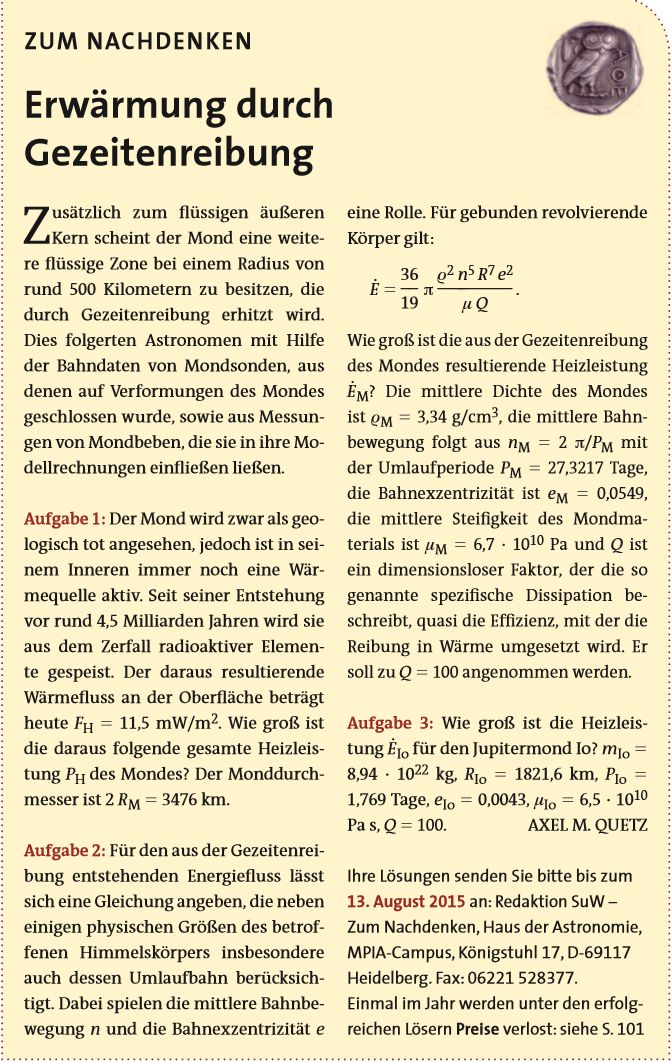 jetzt komme ich ins grübeln. ich meinte erst kürzlich etwas zum Energiehaushlt des Mondes diesbezüglich gelesen zu haben. Aber die Sache mit der gebundenen Rotation ist dabei wirklich hinderlich. Ich muß da noch mal drüber aber nicht mehr heute. Namaste