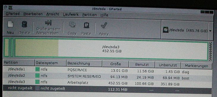 Hallo zusammen, ich habe schon mehrfach Betriebssysteme von HDD auf SSD geklont (2 XP-Pcs und 1 Win 7 PC, Eigenbau, 1 Acer Notebokk mit XP und ein Netbook mit XP). Nur jetzt habe ich das Notebook meiner Göttergattin umstricken wollen. Es ist eine Acer Travelmate mit werkseitiger WIN7 Installation. Das Klonen von HDD aus die SSD habe ich mit Acronis erfolgreich durchgeführt, d.h., das Notebook läuft wieder. Wie erwartert stimmt aber das Alignemnt nicht laut AS SSD Benchmark. Also gparted gestartet und die Partitionen "aligned". Nur danach lief nichts mehr. Vor dem eigentlichen Start von WIN 7 gabe es eine Fehlermeldung (habe ich leider nicht photographiert) mit E00000irgendwas und die Anmerkung, das ich einen "Reparaturinstallation" durchführen soll.?????? (Selbstgebrannte Recovery-CDs habe ich vorliegen). Ich habe das Algnment dann mit Partition Wizard durchgeführt, selber Effekt. Nun, was soll ich wie machen? Aktuelle ist die SSD also Misaligned (läuft aber). Screenshot siehe Photo. Da sind drei Partitionen: PQSERVICE, System Reserved / Boot, und Arbeitsplatz.. hat einer hier Erfahrung mit diesem problem, müßte bei allen Acer Notebooks mit WIN 7 so sein. Ach ja, bitte keine Tips a la "Neuinstallation".