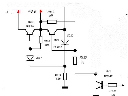 Hallo Kurze Frage zum umschalten mit Transistoren. Wenn ich +5V an die basis von Q31 lege liegen am C von Q29 +8Volt an und umgekehrt .OK Nun aber,ich muss Q31 mit Basis nach Masse ansteuern also mit einem PNP Transistor PNP 857öä. Basis über 10K mit Taster nach Gnd. Collector an Gnd und Emitter an den 1K Widerstand. Oder liege ich da falsch? Gruß Silvio