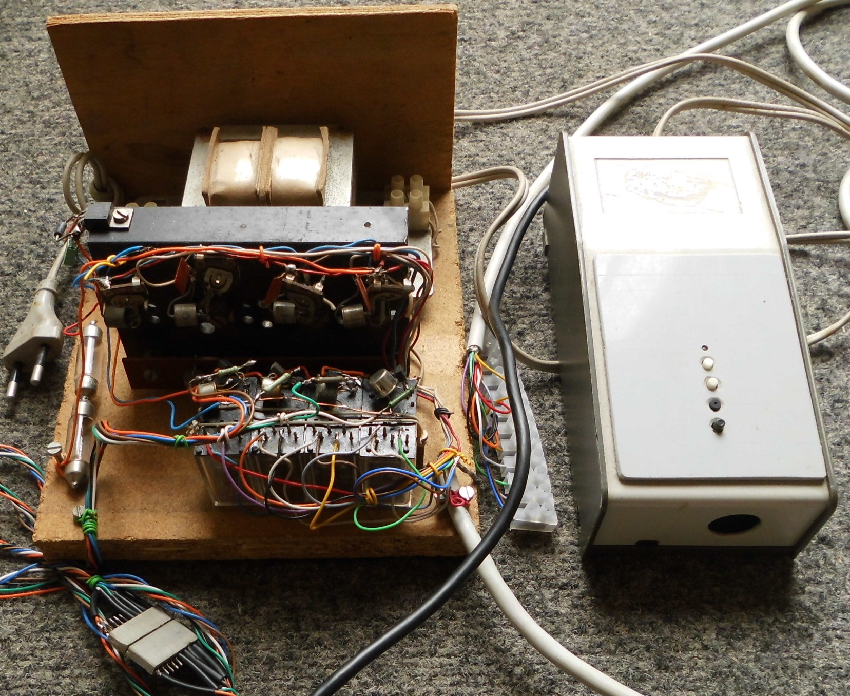 Glaube das ist das letzte Teil dieser Art welches im Club Mitte der 90er gebaut , eingesetzt wurde. Es schaltete ein 4 Fachkreis für verschiedene Spuren. Analoge Fahrspannungseinstellung mit Relaisblock Abschaltung . Mit dem Taster über die Relais konnten die Loks gestartet werden. Immerhin hatten diese schon eine Abfallverzögerung damit die Lok auf den Block nicht hoppelte! Die Halteblöcke waren wichtig damit die Loks auch immer aus der Reichweite auf Position stoppten. Mangels positiv Regler wurden hier Negativregler eingesetzt, die hatten wir zu hauf. Ein ET65 aus Inducal Göllingen ohne Wicklungshinweise wurde schwarz für den Club gemacht.Er hatte eine Ausgangsspannung von 16V und wurde speziell für Modelleisenbahner "schwarz" gewickelt. Das "Gehäuse wurde wie man sieht schnell zurecht gehämmert. Damals konnte noch keiner ahnen das Dieses Teil funktionsfähig so lange überlebt. Unkenntnis hat seine Vorteile. Weil von den Modellbahnern keine eine Ahnung von der Funktion hatte wurde es in eine tiefe Ecke positioniert. Gruß