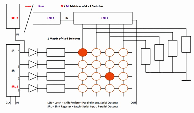Ich dachte, ich hätte es beschrieben: Mehrere dieser Taster auslesen und wenige Pins verschwenden. Paralleles Lesen würde 64 Leitungen verbrauchen. Tempo: 1kHz Abtastung reicht völlig aus. Die Frage ist nur, ob die Schaltung so stimmt, bevor Ich die Platinen bestelle. Die kosten nur 1,- das Stück, zgl den Schiebereigstern. Auch die habe Ich in Platinenform. Ich hatte dann alles für 20,- beisammen. Ich will die Bilder nicht reinstellen, wegen Copyright, aber man kann die auf Ebaby finden: 4 x 4 Matrix Array 16 Tasten Man kann dort auch die Leiterbahnen sehen. Die sind so maxtritzenartig verschaltet.
