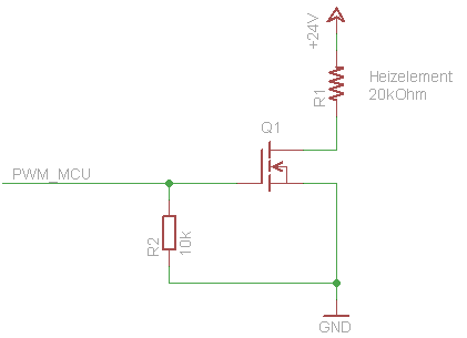 Hallo zusammen, ich designe momentan eine Platine für einen neu entwickelten opto-elektischen Chip. Die Hauptaufgabe des Chips spielt keine Rolle in meiner Frage. Es bezieht sich nur auf ein im Chip integrierten Heizelements welches ich ansteueren muss. Über das Heizelement habe ich folgende Information: Der Wiederstand/Länge des Heizelements beträgt ca. 100 Ohm/um und die länge des Elements beträgt 200um => ein gesamt Wiederstand von 20 kOhm. Ich muss das Heizelement im Bereich von 0 bis 10-20mW betreiben, d.h es soll möglich sein einen sweep durchzuführen. Bei 10mW und 20kOhm wäre eine Spannung von ca. 14V und ein Strom von 700uA nötig. Mein Ansatz wäre, einen PWM Ausgang des MCUs auf der Platine zu verwenden um einen MOSFET zu steuern (siehe Abb.). Macht mein Ansatz überhaupt Sinn? Gibt es etwas auf das ich achten muss bei der Schaltung? Gibt es villeicht andere/"bessere" Möglichkeiten eine solche Steuerung zu implementieren. Danke im Voraus, Grüße Samuel