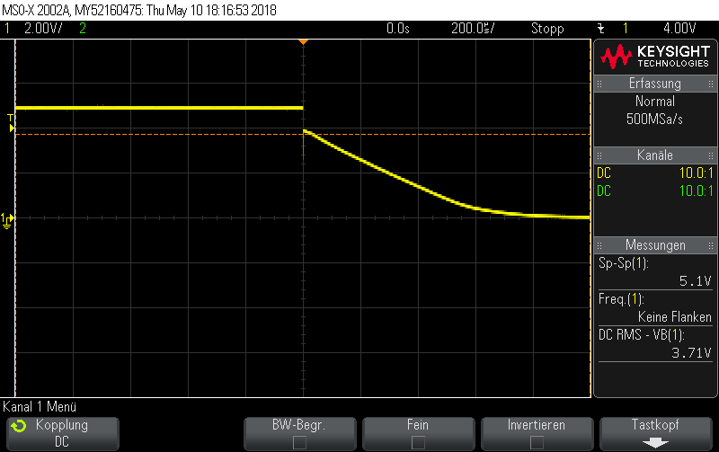 Mein Netzteil basiert auf dem angehangenen Plan. NPN2, NPN3, D2, R1, R2 und R3 sind lediglich die Nachmodulierung eines TIP120/BD677. Hab nen Switcher mit im Rennen der dafür sorgt, dass die Eingangsspannung so ca. 4V über der Ausgangsspannung liegt. Damit konnte ich den Spass dann relativ klein realisieren, mein Gehäuse ist grad mal 105mm*160mm*54mm groß bei ~10mV...24V, 0...1A Gesteuert (nicht geregelt!) wird mein Netzteil von einem Atmega328p. Das Oszi-Bild zeigt die Klemmenspannung bei eingestellten 5V Ausgangsspannung und max. 10mA Strom und Zuschaltung eines 4.7 Ohm Widerstandes (von meinem letzten aufgebauten LNG vom März diesen Jahres). Vielleicht ist das auch eine Überlegung für den TE wert