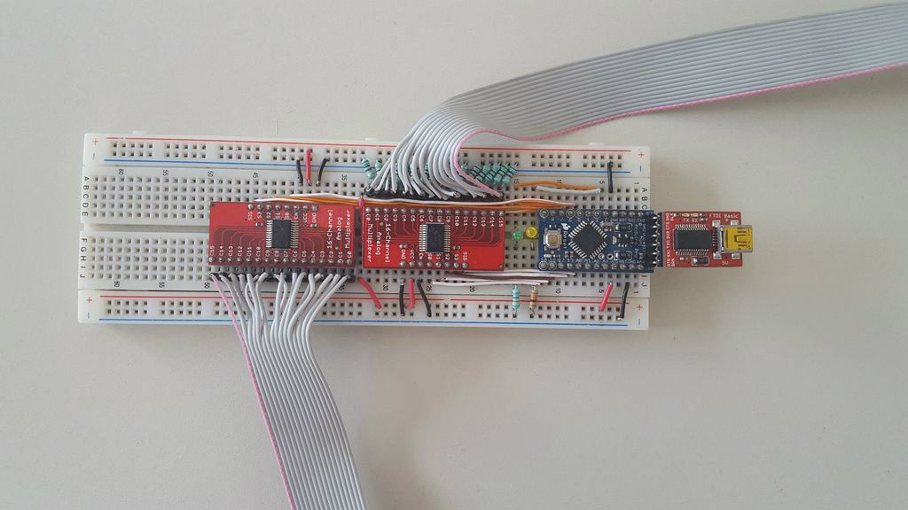 Moin! Für ein Projekt an der Hochschule soll eine Schuhsohle entwickelt werden, die es ermöglicht die Druckpunkte grafisch darzustellen. Die Sohle habe ich sozusagen schon fertig entworfen (6x12 Array, also 72 Sensoren) und sie soll auf dem Prinzip mit Velostat als Zwischenschicht funktionieren (siehe Bild im Anhang). Für die Elektronik stehen mir ein Arduino Pro Mini und zwei 16-Channel Analog Multiplexer von Sparkfun zur verfügung. Da ich mit Arduino noch nie zu tun hatte und die Zeit es mir nicht ermöglicht mit da einzuarbeiten, wäre meine Frage nun: Gibt es jemanden hier der auf dem Gebiet fit ist und mir hierzu etwas programmieren könnte? Im Idealfall sieht es am Ende so aus wie hier https://www.youtube.com/watch?v=wvJvYTQQDM0, eventuell sogar noch in farbiger Darstellung bei geringem Druck grün, bei starkem rot usw. Selbstverständlich würde es dafür eine kleine Aufwandsentschädigung geben! Wie gesagt mir ist es leider zeitlich nicht möglich mich in das Gebiet Arduino und Processing einzuarbeiten, ansonsten würde ich nicht darum bitten. Und schon mal vorab, bitte erspart euch unnötige Kommentare!! Wenn jemand sowas drauf hat, bitte per Mail hier melden. Wie bereits erwähnt, wäre natürlich nicht umsonst! ;) Vielen Dank.