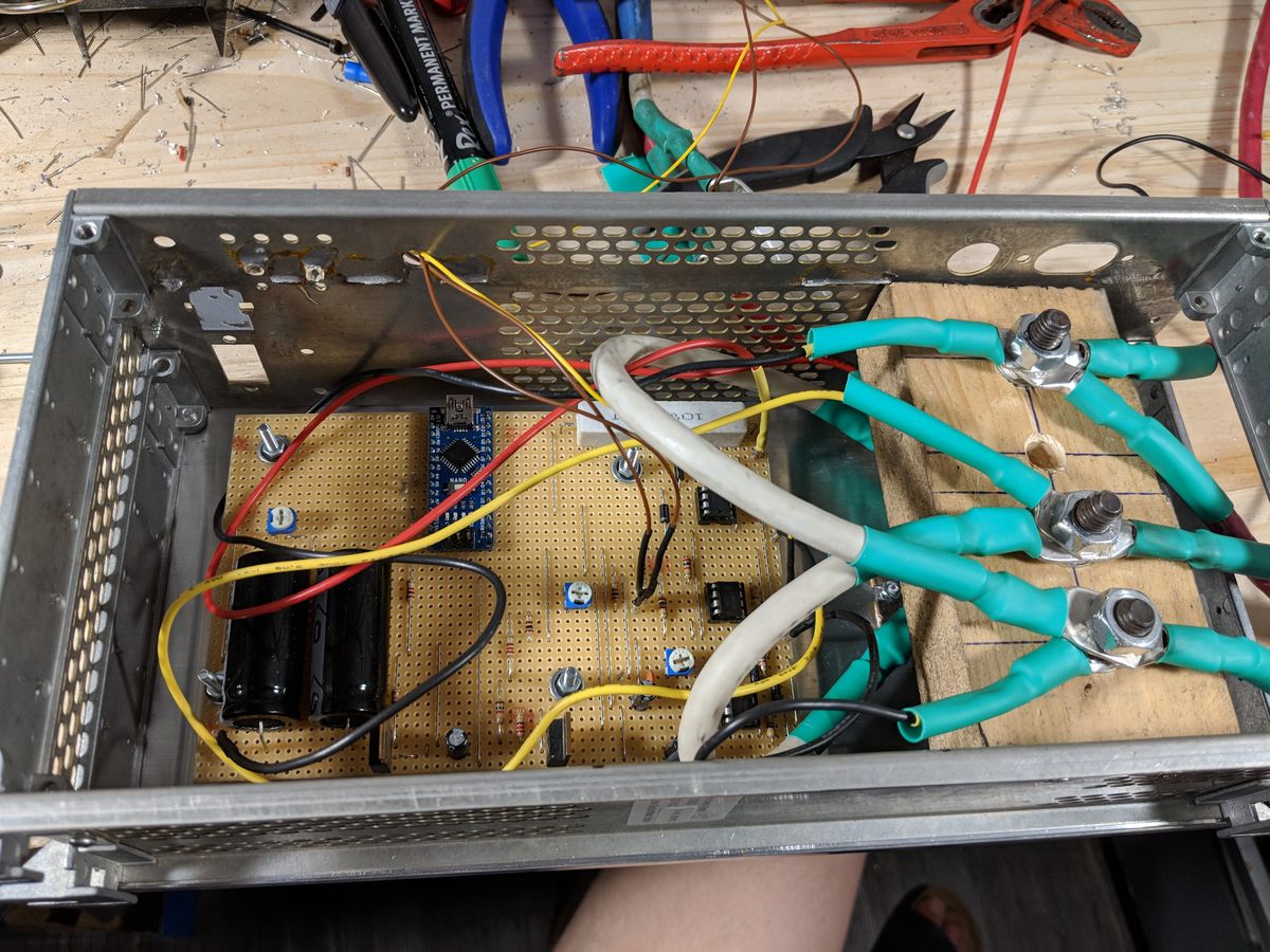 Wenn das tatsächlich geht, dann würde ich ihm sogar 4 mal bts7960 spendieren. Die sind sehr einfach anzusteuern und haben nichtmal einen Lüfter. Außerdem habe ich da nicht das Problem, dass ich die doppelte Stromstärke berechnen muß, weil sie für 24 volt und nicht für 50 oder gar 100 volt gemacht sind... Das wären dann 160A insgesamt...