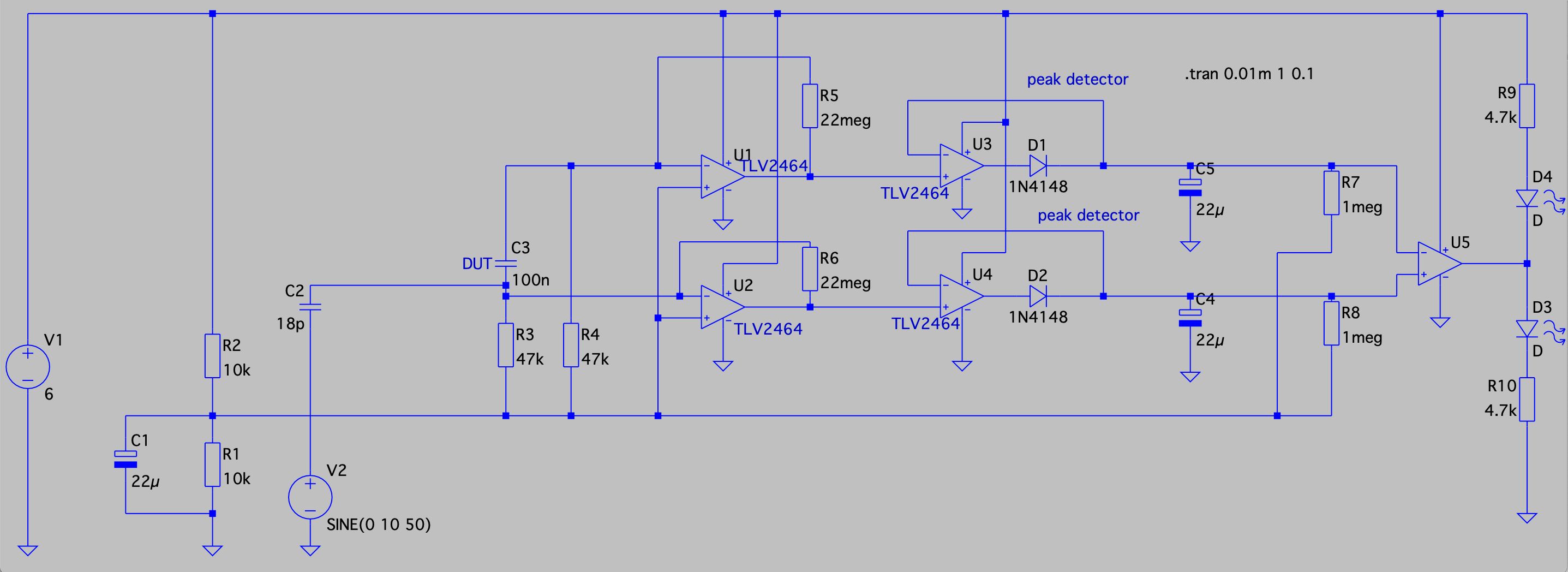 Ui, welche Diskussion habe ich da losgetreten... Anbei zwei Vorschläge für die Schaltung. Die Eingangs-OpAmps sorgen dafür, dass die Spannung auf beiden Kondensatorseiten Null ist. Der eingekoppelte Strom wird in eine Spannung gewandelt, so dass der kompensierende Strom durch den Gegenkopplungs-Widerstand fließt. https://de.wikipedia.org/wiki/Transimpedanzverstärker Die Widerstände R3 und R4 (47k) sind optional, da durch sie kein Strom fließt, da an ihnen idealerweise keine Spannung abfällt. Im Vorschlag 1 werden die beiden Spannungen nur verglichen. Nachteil ist, dass immer eine der beiden LEDs leuchtet. Im Vorschlag 2 werden 2 LEDs über einen Fensterdiskriminator gesteuert. Siehe auch die angehängte LTspice-Datei. Hier leuchtet im Normalfall keine LED, beim Berühren des DUT leuchtet die LED der entsprechenden Seite. Evtl. muss man die Fensterbreite über R12 (1k) anpassen. > Aber was den TO treibt, eine Frage zu stellen, > obwohl er alles weiß, erschließt sich mir nicht. Welche Frage habe ich gestellt? Ich wollte nur auf die Tatsache hinweisen, dass in empfindlichen Schaltungen die Einbaurichtung eine Rolle spielen kann. Genau wie das heiße und das kalte Ende einer Spule oft von Belang ist.