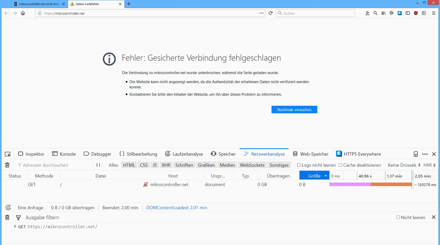 Stand der Dinge: mit dem aktuellem FireFox kann ich mikrocontroller.net nicht aufrufen. Bei anderen Seiten besteht dieses Problem nicht. Interessant ist, dass das Problem bis jetzt nur bei mir auftaucht. Die FF-eigene Netzwerkanalyse zeigt keine relevanten Ergebnisse (siehe Anhang). Gibt es ein Tool, das den gesamten Aufruf auf Paketebene aufzeichnen kann?