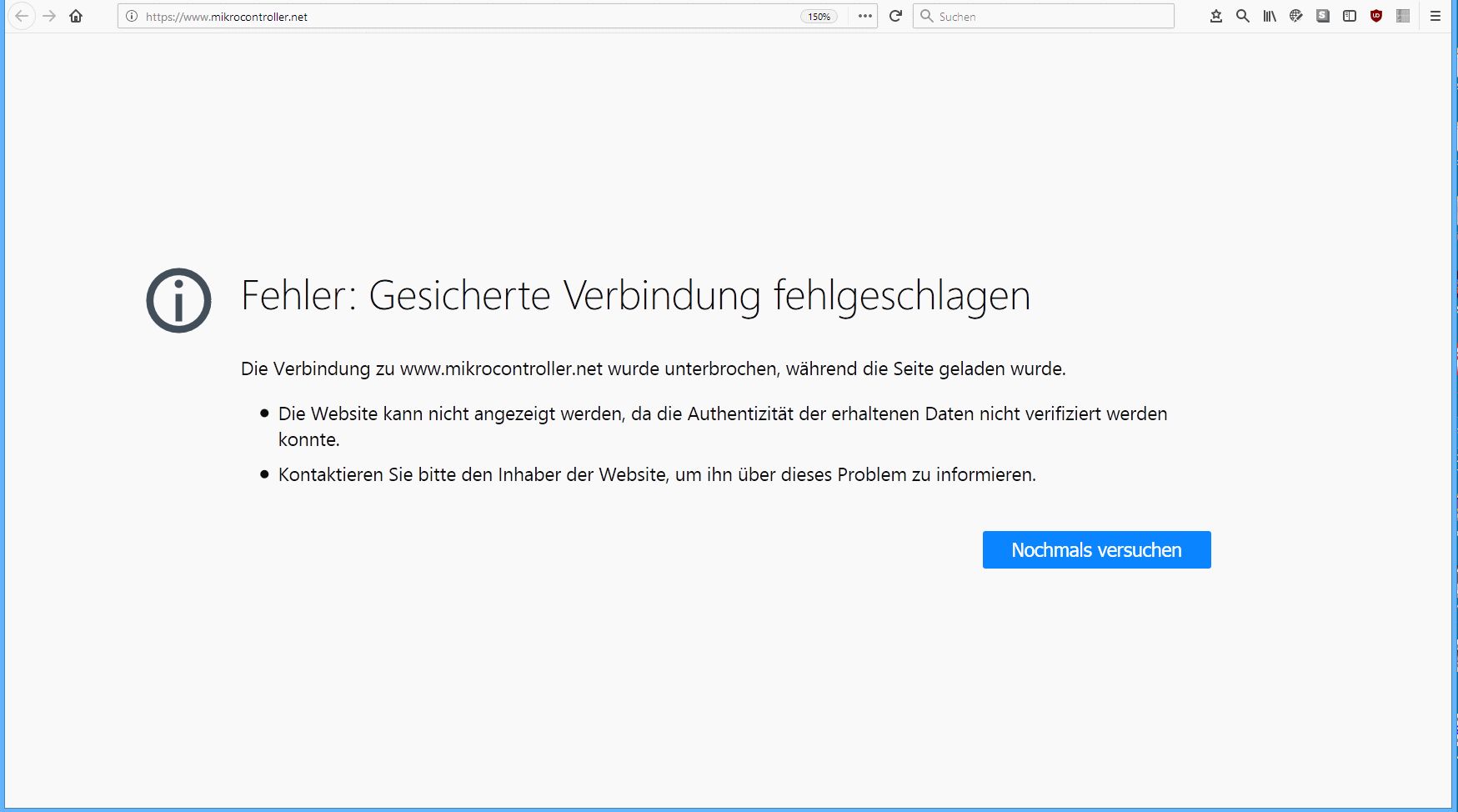 Mikrocontroller.net nutzt noch ein zweites Zertifikat, dem von Mozilla nicht mehr vertraut wird. https://www.ssllabs.com/ssltest/analyze.html?d=www.mikrocontroller.net Vielleicht versucht Dein Browser darüber zuzugreifen. Probiere mal die Anleitung von: https://www.giga.de/downloads/mozilla-firefox/tipps/fehlermeldung-gesicherte-verbindung-fehlgeschlagen-umgehen-so-klappts/