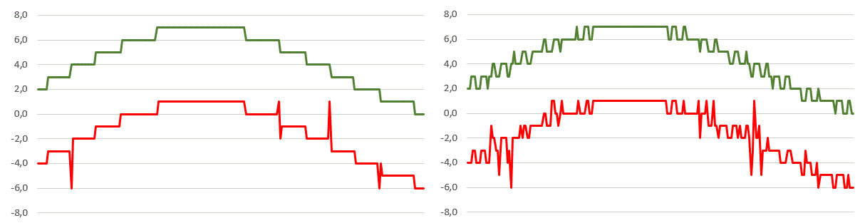 Moin, Um den Spass nochmehr zu verderben, merk' ich mal an, dass ein R2R Netzwerk nicht auf allen seinen Eingangsbits die selbe Last darstellt, d.h. die einzelnen Digitalausgaenge werden mit unterschiedlichen Lasten belastet, wodurch sicherlich ihre Ausgangsspannung (auf der ja eh' schon der ganze "Dreck", der ueblicherweise auf Betriebsspannungen fuer Digitalschaltungen ist, ist) auch froehlich vor sich hinwackelt. Gruss WK
