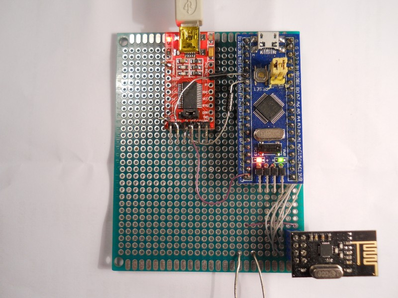 DatWartWatt schrieb: > Hat jemand ein ganz simples Beispiel in einfachem C griffbereit Einfach geht nicht, dazu ist der Chip zu gut und zu gut beladen mit Features. Ich hab schon geraume Zeit mein Testboard herumliegen, dann nehme ich dieses Thema zum Anlass meinen Aufbau mal zu zeigen. Ich verwende ein Bluepill der billigsten Sorte, verdrahte es mit dem NRF24L01+ und hänge noch einen FT232 USB-zu-Seriell Adapter dran damit ich nicht den USB-Teil der Software noch mit herum- schleppen muss. Der ganze Aufbau speist sich auch zuverlässig aus dem FT232 Adapter Board über USB. Die ganze Geschichte dient zum Austesten und ist kompatibel mit den hier gezeigten Schöpfungen: Beitrag "NRF24L01 - Testprogramm für Windows PC" Beitrag "NRF24L01+ test program for Arduino Uno" Beitrag "NRF24L01+ test program for Arduino Mega"