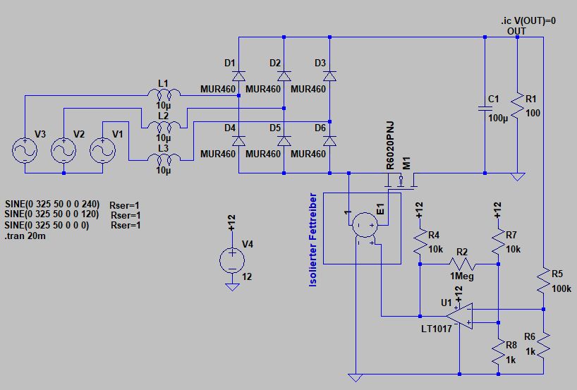 Al3ko -. schrieb: > Anbei der neue Schaltplan. Der entscheidende Trick sind die Speicherdrosseln L1, L2 und L3. Nur dadurch kann man die FETs so steuern, daß die Substratdioden nicht kurzschließen. Man hat dadurch an den FETs auch nicht mehr den 50Hz Drehstrom. Diese Drosseln fehlen aber in der Originalschaltung, diese kann daher nur gleichrichten.