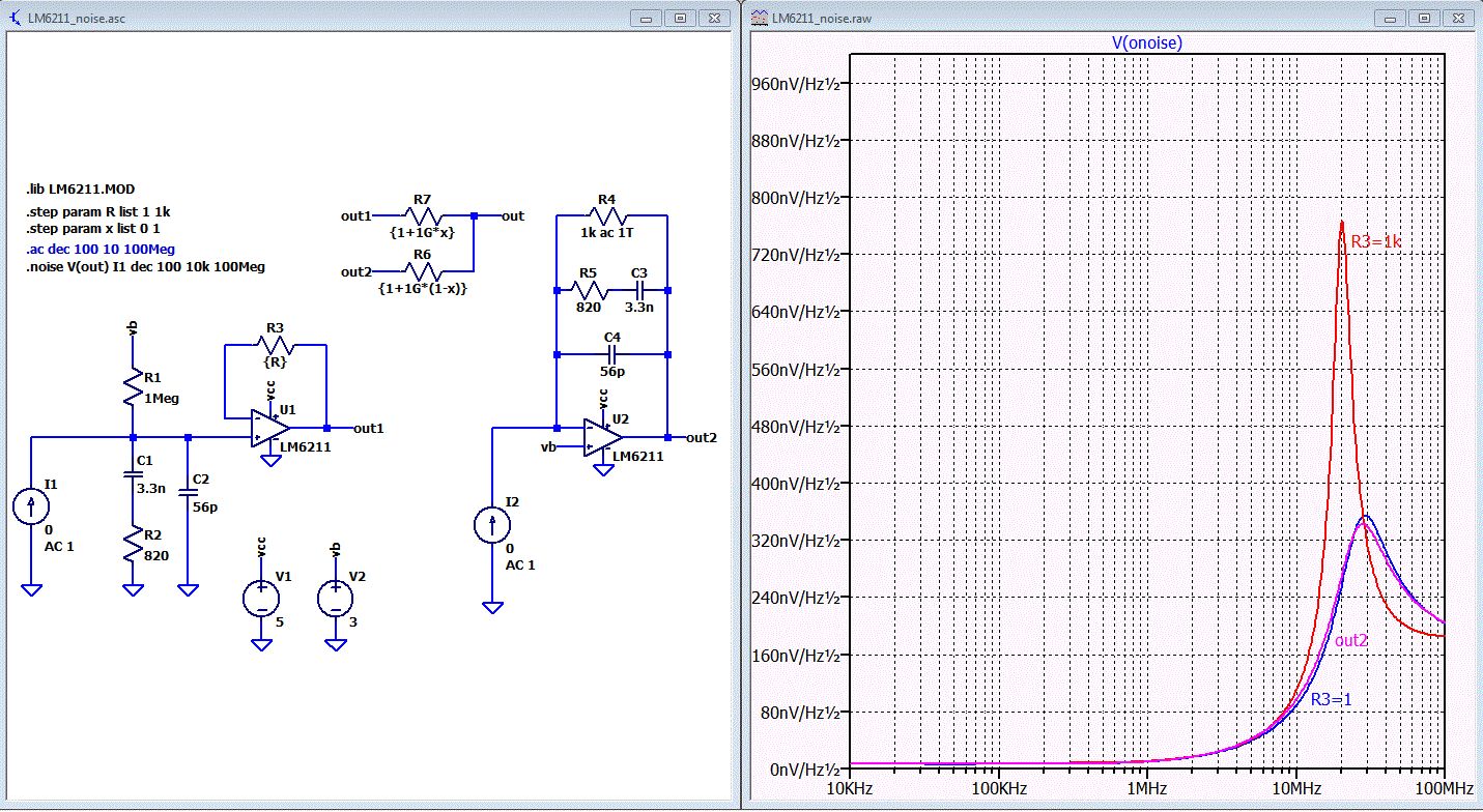 Ich bin überzeugt davon, dass du mit R1 eine bilderbuchmäßige Phasendrehung in der Gegenkopplung erzeugst, so dass der Op-Amp bei 20 MHz schwingt. In der Simulation zeigt sich das durch eine unsinnig hohe Verstärkung - ca. 200-fach bei 20 MHz - wo soll die denn herkommen? GBW ist 17 MHz, nicht 4 Ghz! Nebenbei: Ein 1k-Widerstand erzeugt fast genau so viel Rauschen wie der 6211 selber. Auch aus diesem Grund keine gute Idee. Mach' mal 0 Ohm daraus. DZDZ