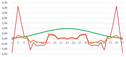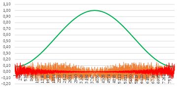 Peter schrieb: > sodass ich nicht einfach > eine Tabelle nehmen und nicht benötigte Punkte weglassen kann. Was wäre, die Punkte einfach zu interpolieren? Meistens bemüht man doch bei solchen Anwendungen nicht den Prozessor mit einer so aufwändigen Berechnung, sondern nutzt den heute in Massen vorhandenen Speicher und macht das offline. Es läuft doch eh auf eine ungenaue Abbildung durch Annäherung hinaus. Da fände ich eine Tabelle mit quadratischer Interpolation besser. Damit wären auch unterschiedliche Kaiser-Fenster gleich miterschlagen. Selbst bei einer linearen Interpolation mit 37 aus 64 Punkten und einer Phasenauflösung von nur 8 Bit! bekommt man bei einem von-Hann-Fenster nur 3% maximalen relativen- und 0,005 absoluten Fehler. Siehe Bild aus meinem Fundus. (absoluter Fehler orange x 100, relativer Fehler rot in Prozent). Da die Fenster in der Regel für sequenziell eintrudelnde Daten benötigt werden, man könnte die Werte auch noch mit einem sehr einfachen FIR-Filter glätten, um Interpoliertes abzurunden. W.S. schrieb: > das Jetztzeit-Sample genau zwischen deinen beiden mittleren Samples Das ließe sich auch mit den Koeffizienten korrigieren, wenn nötig, oder man füllt eine Null, wenn es die Anwendung erlaubt, ich glaube aber, dass es bei der Anwendung nicht so sehr darauf ankommt. Allerdings ist die 666 ja die einzige gerade Zahl in dem Verein und damit hinterfragenswert. Sicher kann man auch 667 nehmen. Bibeltreue Entwickler werden sich ohnehin weigern, ausgerechnet die zu implementieren. Ich würde auch noch die Frage einwerfen, woher die Koeffizienten kommen? Sollen die auch online berechnet werden? Das scheint mir gfs noch aufwändiger, sofern es nicht einfach ein Tiefpass ist.