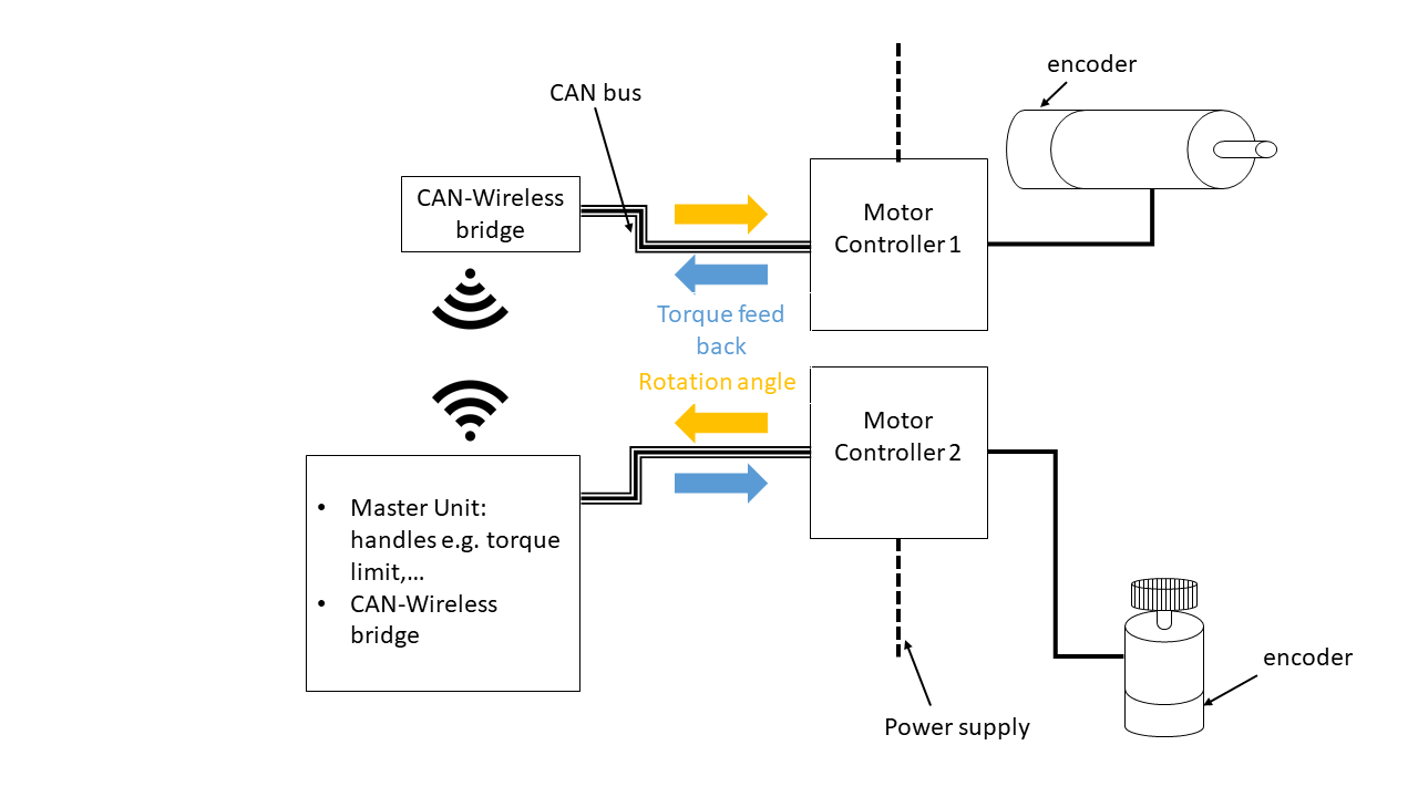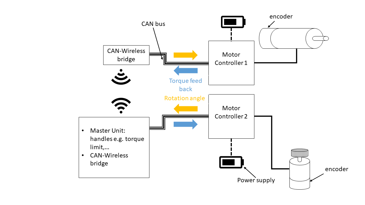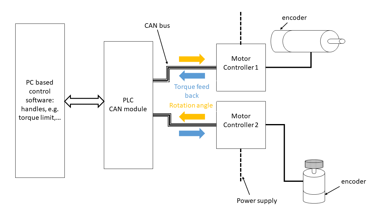 Hallo liebe Community, ich habe hier im Forum nach ähnlichen Beiträgen gesucht, jedoch keine passende Lösung gefunden. Kurz zum Hintergrund der Aufgabenstellung. Nach Wartungsarbeiten muss auf einem Prüfstand an manchen Prüflingen bei einer Einstellschraube, eine Feinjustierung bei laufendem Prüfling vorgenommen werden. Um das Risiko für den Bediener zu minimieren, soll dies zukünftig vom Bedienraum aus ermöglicht werden. Dabei wird Force-Feedback verlangt, d.h. das Drehmoment, welches der Motor am Prüfling (Motor beim Schraubendreher) erfährt, soll der Bediener beim Verdrehen des Drehknopfes ebenso erfahren. Somit wird in eine Richtung das Drehmoment übertragen und in die andere Richtung der Verdrehwinkel (Verdrehung durch den Benutzer). Im Zuge einer Neurealisierung setzten wir es gemäß dem angehängten Bild "Concept_current" um. Die Bediensoftware verwaltet verschiedene Prüflingstypen und die entsprechenden Maximalwerte (max. Drehmoment je Prüfling,...). Dies wird in die SPS gespielt und die Kommunikation zwischen den beiden Motoren von der SPS abgewickelt. Für bestehende Anlagen soll eine Nachrüstung solch einer remote Einstellung angedacht werden (Anhang "Concept_new"). Um keine Kabel zwischen Prüfraum und Bedienraum verlegen zu müssen wäre eine Funk-Lösung ideal. Wir überlegen folgende Motoren, sowohl am Schraubendreher als auch als Feedback-Motor zu verwenden: https://en.nanotec.com/products/1609-pd4-c6018l4204-e-08/ Ich habe jetzt folgende zwei Fragen: 1.) Kennt jemand bereits umgesetzte CANopen - Wireless - CANopen Lösungen. Ich habe das CANopen-Motor-Manual noch nicht gänzlich durchgearbeitet. Um dem Bediener ein vernünftiges Feedback bzw. relativ zeitnah die verdrehte Winkelinformation an den Schrauben-Drehermotor zu übergeben, sollte die Verzögerung wohl nicht mehr als max. einige 0,1 sec. betragen. Weil der Bediener den Prüfling (wegen des max. zulässigen Drehmoments) auswählen muss, ist ein kleines Display nötig/ideal. Ich habe ZigBee, Bluetooth 5.0 oder direkte WLAN-Kopplung angedacht. Z.B. via Raspberry die Prüflingsverwaltung und dann zwei Arduinos via ZigBee koppeln. Ebenso würden die ESP32-Chips einen Ansatz darstellen, diese könnten direkt ein Touch-Display ansprechen. Vielleicht kann dabei wer praktische Tipps liefern, was für oder gegen einen Ansatz spricht. 2.) Das max. Drehmoment beträgt ca. 2 Nm und die Drehzahl ist relativ gering (menschliche Hand). Somit ist die maximale Leistung als auch Energie für einen Einstellprozess sehr gering. Dafür würden sich eine eigenständige Versorgung via Akkus von jeder der zwei Einheiten (Schraubendreher, Bedieneinheit) anbieten. Die Motoren arbeiten von 12 V - 48 V. Ich hätte dabei an eine Akkulösung wie bei einem Akkuschrauber gedacht, d.h. eigenständige Akkus, welche einfach in die Einheiten eingesteckt werden. Es ist möglich von jedem Akkuschrauber-Hersteller von Akkus zu kaufen, jedoch ist das Gegenstück der Akkuhalterung nicht eigenständig verfügbar (weil auch kein Bedarf dafür besteht). Ich wollte fragen, ob jemand einen Anbieter von einer solchen Lösung kennt, d.h. komplett Konfektionierte Akkupacks welche nicht angesteckt werden müssen, sondern einfach in einen Slot gesteckt werden und der el. Kontakt hergestellt wird und wofür man auch passende Ladegeräte bekommt. Besten Dank für euere Hilfe, Markus