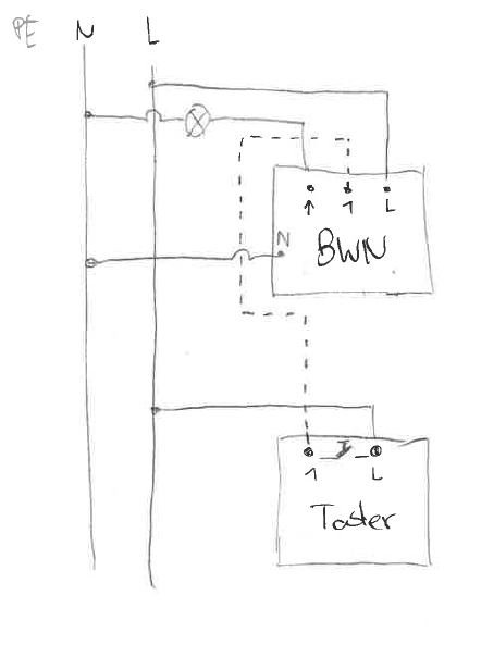Hallo Forum, bei mir im Flur befinden sich LED-Deckenspots mit Vorschaltgerät. Diese werden von einem Siemens Delta 5tc1 500 sowie einer Nebenstelle gesteuert. Der BWM übernimmt dabei auch die Timerfunktion. Beim nächtlichen Toilettengang blenden die Spots doch ganz schön heftig, sodass ein Dimmer her muss. Ich habe noch einen Eltako EUD61NPN UC Universaldimmer in der Schublade der hier seinen Einsatz finden könnte. Der Dimmer übernimmt nach einer Spannungsunterbrechung wieder den zuletzt bekannten Helligkeitswert. Nun kam mir die Idee den Dimmer nach dem Bewegungsmelder zu setzen und über die Nebenstelle den Helligkeitswert zu regulieren. Gemäß Datenblatt sollte das alles funzen: Dimmer: https://www.eltako.com/fileadmin/downloads/de/_bedienung/EUD61NPN_61100801-3_dtsch.pdf Bewegungsmelder: https://cache.industry.siemens.com/dl/files/622/42807622/att_42736/v1/2516514121_tpi.pdf Anhang "Grundschaltung.png" zeigt den Ausgangszustand und "Grundschaltung_mit_Dimmer.png" meine "Lösung". Die Frage hierbei ist ob a) der Dimmer das ständige An- und Ausschalten verkraftet und b) das Relais des BWMs den Vorgang der Helligkeitseinstellung verzeiht da hier die Nebenstelle doch für einige Sekunden aktiv bleiben würde. Was haltet ihr von dieser unkonventionellen Lösung? Tausend Dank und ich freue mich auf euer Feedback!