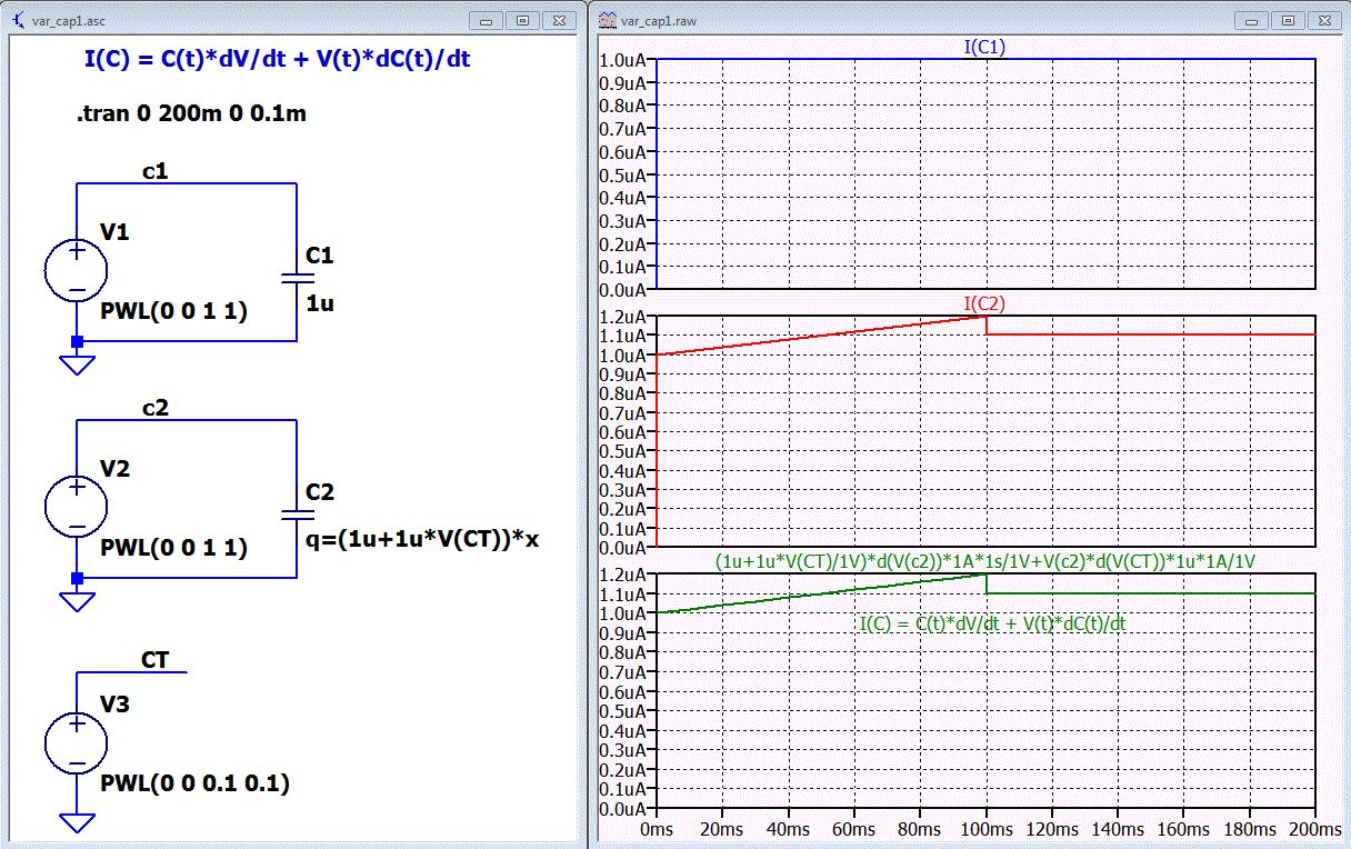 lt. LTspice-Hilfe sollte die Definition einer variablen bzw. nichtlinearen Kapapzität über die Ladung Q möglich sein, wobei die spezielle Variable x der aktuellen am Kondensator anliegenden Spannung entspricht (Q=C*U). Zum Testen mit einer linear mit 1V/s ansteigenden Spannung gespeist - dann entspricht der Zahlenwert des Stroms durch den Kondensator in Ampere der Kapazität in Farad. Allerdings irritiert mich dabei der Endwert von 1.2µF anstelle der erwarteten 1.1µF. Explizites Klammern hilft nicht und das Einbauen eines Funktionsaufrufs (cx) innerhalb der Q-Formel führt zu einer Fehlermeldung (no such function). Das dürfte aber ein generelles Problem sein, da ich auch schon bei der Definition von variablen Induktivitäten mittels Funktion die gleiche Fehlermeldung hatte.