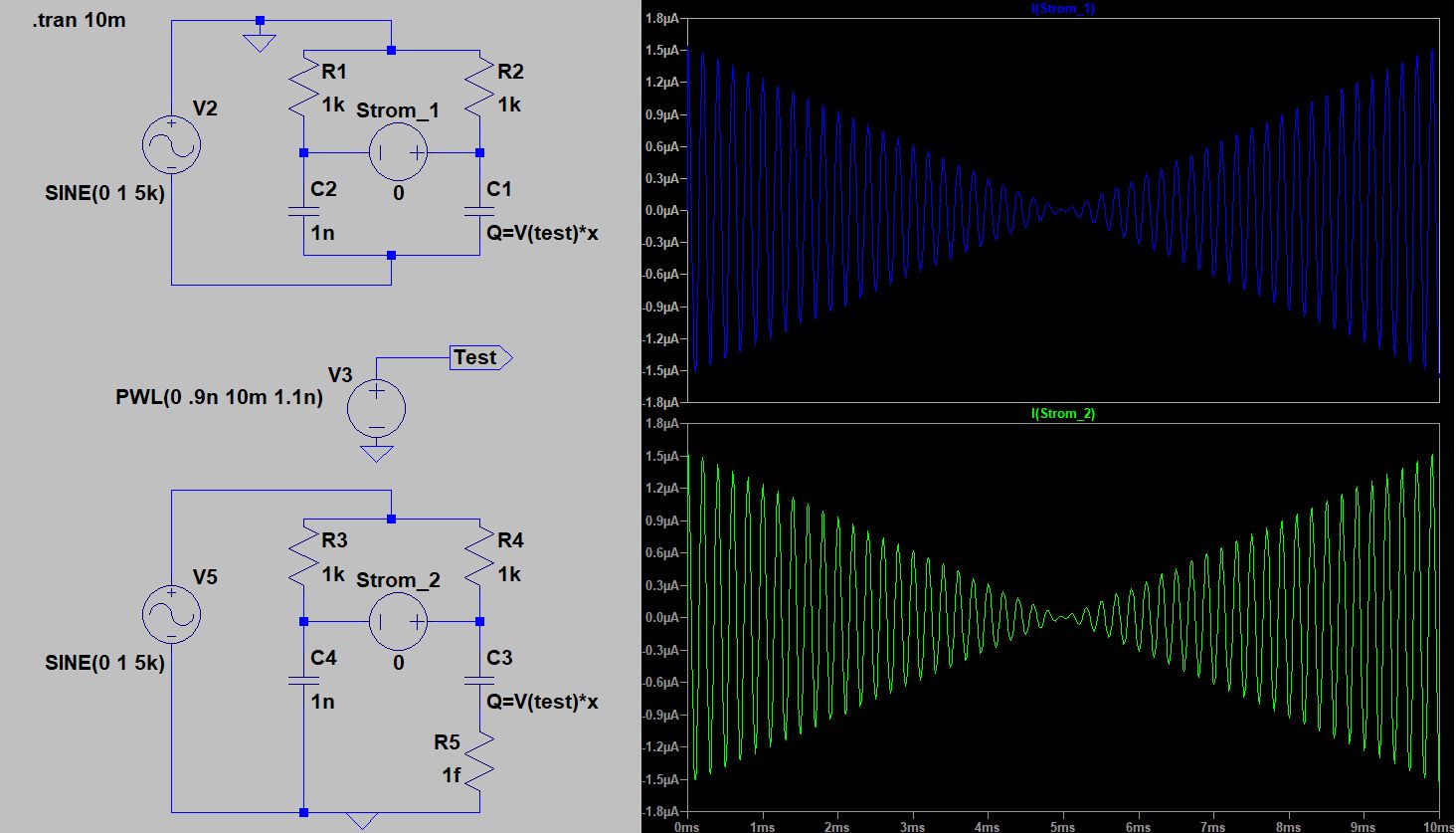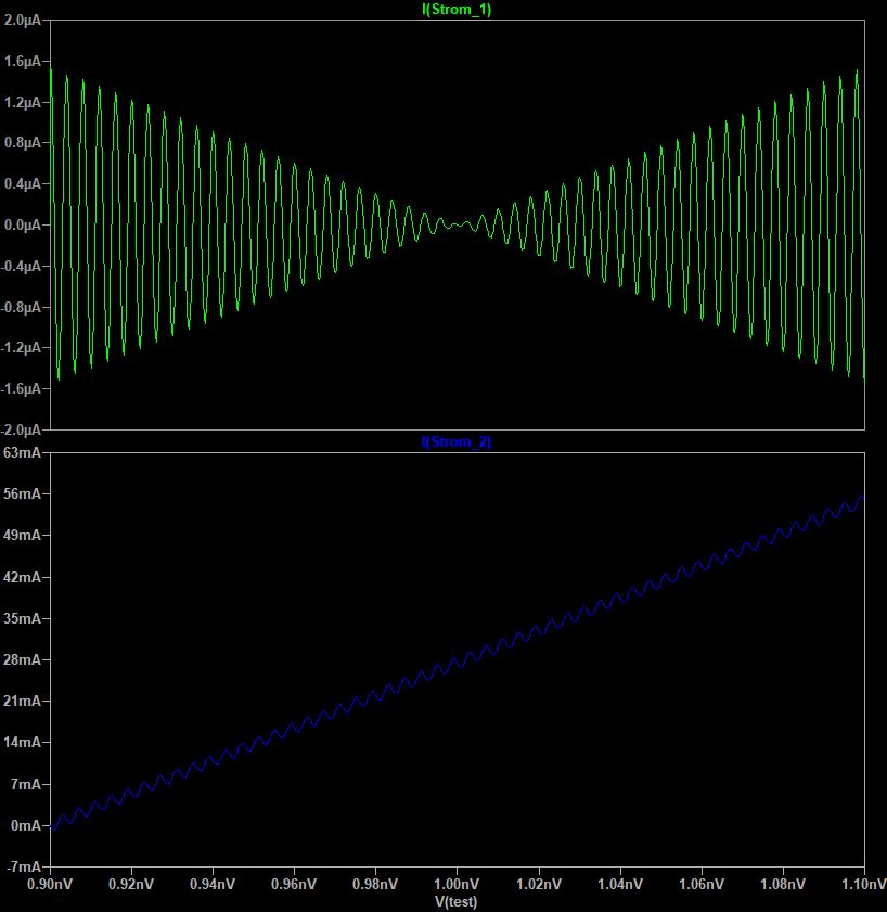 Danke Felsentrau für die Lösung mit dem Serien-R. Ich hatte mit Rser in den Strommessern experimentiert aber das hat nicht wirklich geholfen. Dafür habe ich dann noch eine andere Methode probiert(*_test4) und die scheint auch mit jeder beliebigen Kapazität zu funktionieren. Ich auch noch die von dir erwähnte Lösung mit dem Serienwiderstand angehängt (*_test5). Ich habe Rser=1u genommen. Da könnte man wahrscheinlich auch auf Rser 1m gehen ohne einen größeren Fehler zu machen.
