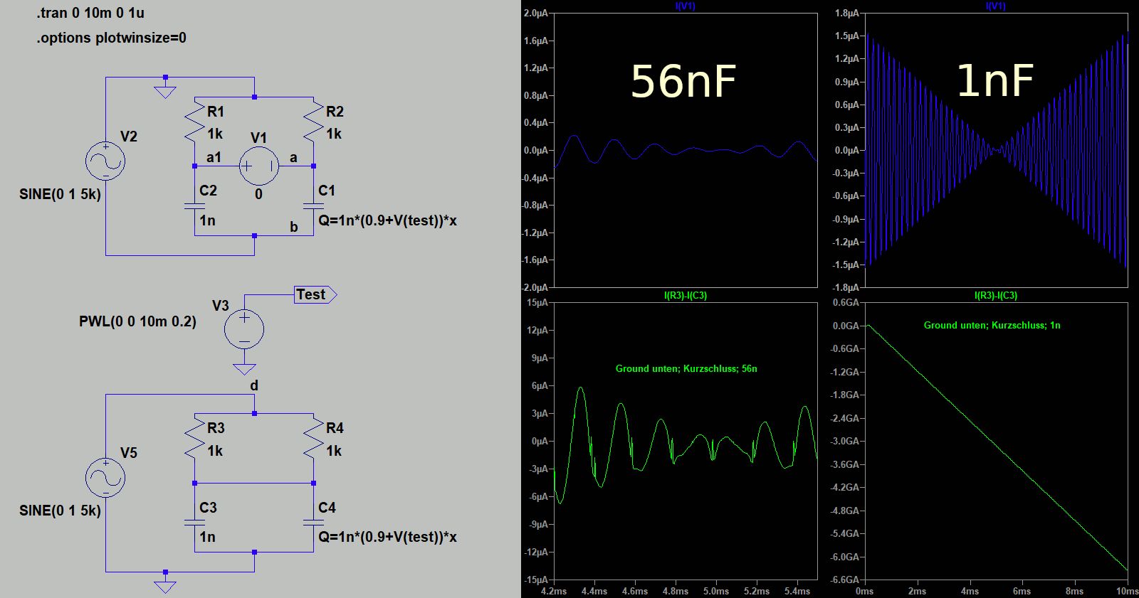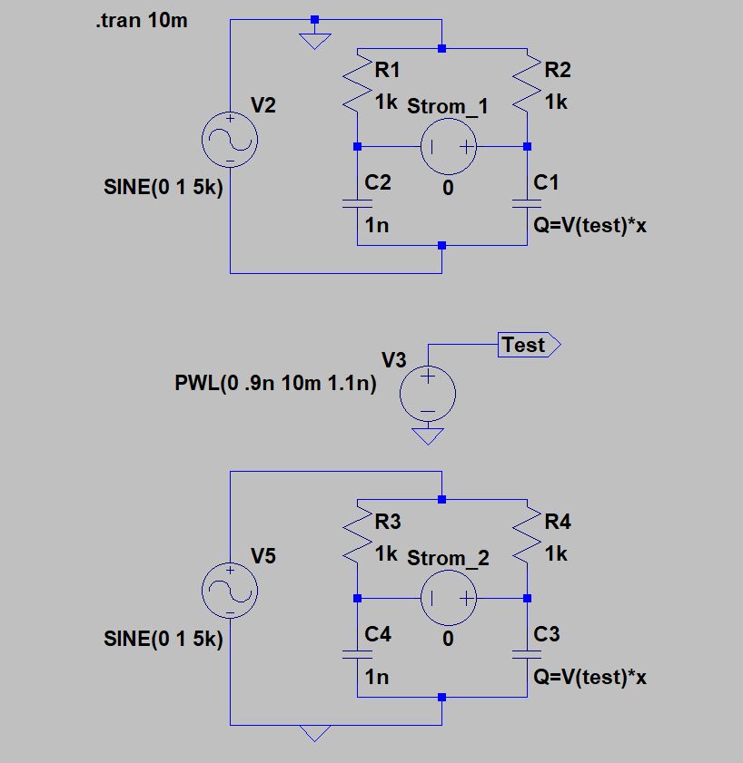 Hi, sorry, ich will den Thread nicht kapern, aber bei mir funktioniert es mit einer Spannungsquelle im Bauteilewert nicht richtig. Die obere Schaltung läuft, wie sie soll, die Untere nicht. Der einzige Unterschied: der Ground ist mit dem veränderbaren Kondensator und der Steuerquelle verbunden. Ist das mein Fehler oder soll das so sein? Grüße