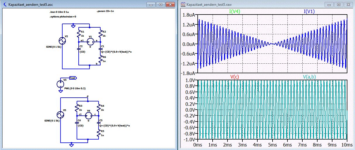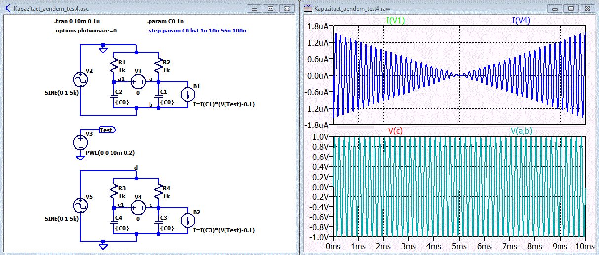 Danke "nop23" für deine Vorlage. ich habe die Schaltung dann noch etwas ausgebaut und die Formel für den Strom hinzugefügt. Siehe Datei var_cap1.asc. I(C) = C(t)*dV/dt + V(t)*dC(t)/dt C(t) = Cconst + Cvar(t) LTspice: Q = (Cconst + Cvar(t))*x Gruß Helmut