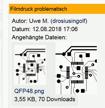 michael_ schrieb: > Im FF W7 ist es auch doppelt groß. Zeno schrieb: > Im Safari wird es auch doppelt so groß. Leute, ist ja gut. Im Anhang ist die Darstellung der Briefmarke unter FF. Links ist die Vorschau. Die Unschärfe kommt dabei von der VERKLEINERUNG, die der FF hier nun mal von sich aus vornimmt. Rechts daneben habe ich das Original zur gegenübergestellt mit exakter Pixelgröße hineinkopiert. Das hat 146x186 Pixel. GENAU SO in DIESER Größe wird es auch bei mir im FF beim Draufklicken dann gezeigt (zentriert vom dunkelgrauen Rand umgeben und sonst nichts). Sieht das für euch etwa doppelt so groß aus im Bezug auf das verkleinerte(!) Vorschaubild? Für mich jedenfalls nicht. Zur Wiederholung, das FF Vorschaubild ist nur relativ zum Original etwas kleiner dargestellt (und damit zwangsläufig leicht unscharf). Das ist alles. Es ist im Grunde auch völlig Wumpe. Das Bild taugt einfach zu GAR NICHTS, außer dass es Skalierungsartefakte aufweist. Es taugt nicht zum drucken in dieser Größe und es taugt nicht dazu Aussagen übers drucken zu machen. Wenn man den Ausdruck auf OHP-Folie testen möchte, braucht es MINDESTENS eine Bitmap in der BESTEN (höchsten) Druckerauflösung. Besser in der 2-fachen Druckauflösung, also beispielsweise in 2400dpi für einen 1200dpi Drucker. Also worüber reden wir? Über Piktogrämmchen oder über brauchbare Druckvorlagen? Und mal was anderes, wenn man so viel Geschiss um ein bisschen Ausdruck machen muss, dann läuft gehörig was schief. Besorgt euch einfach ein Layoutprogramm, das ihr auch bedienen könnt, wenn KiCAD hier querschießt oder einen Drucker, der vernünftig druckt oder am besten BEIDES! Anders kann man nämlich keine Platinen mittels Belichtungsmethode selber ätzen. Da bleibt dann höchstens die Tonerbügelmethode noch. Oder geht zum Chinamann und lasst es den für euch machen, wenn ihr es nicht auf die Reihe bekommt. Der kann das nämlich bestimmt. Oder bestellt eure Vorlagen eben bei Bauriedl.