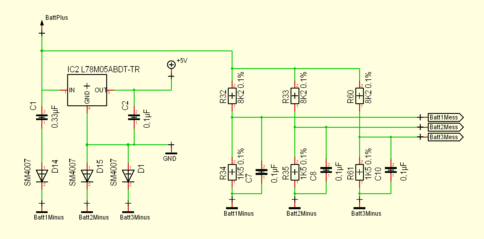 Hallo, ich möchte von mehreren Spannungsquellen die an der Plusleitung miteinander verbunden sind die Spannung messen. An dem gemeinsamen Plus ist ein 5V Spannungsregler. Damit der Spannungsregler immer mit Strom versorgt wird geht von GND zu jeder Spannungsquelle eine Diode. Somit ist ja der GND am Spannungsregler ca. 0,6V höher als an den Minuspolen der Spannungsquellen. Nun mache ich jeweils einen Spannungsteiler von dem gemeinsamen Plus zu den mit Dioden getrennten Ninus(en). Der Arduino hängt an den 5V des Spannungsregler und an dem Minus vom Spannungsregler. Kann das so funktionieren?