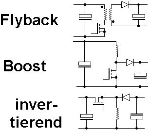 und dann noch eine Menge Detailunterscheidungen wie voltage/current mode Regelung, single ended/half bridge oder push pull/bridge wenn man es feiner unterteilen will. Der 'interessanteste' ist wohl buck boost mit Synchrongleichrichtung, denn der kann wirklch beides, hoch und runter wandeln. Der uninteressanteste ist der inverting, denn der kann zwar auch mehr oder weniger als die Eingangsspannung liefern, aber nur in dem er keine Vorteile nutzt.