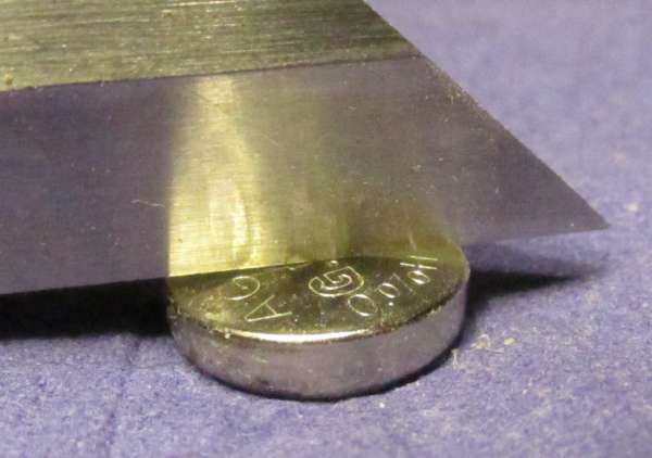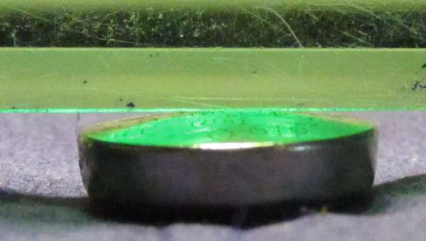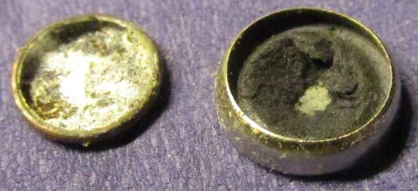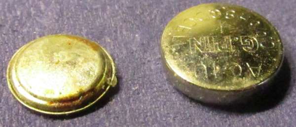 Neben den verbreiteten AA etc. beginnen auch Alkali-Mangan-Knopfzellen zu sabbern und die Gerätekontakte zu schädigen. Ich zeigte neulich AG10-Knöpfe, die noch in der Verpackung waren. Was für mich neu war, dass eine solche platzen kann, in dem Fall außerhalb eines Gerätes! Vor ein paar Tagen fand ich auf dem Küchenboden eine Metallkappe, die ich erstmal nicht zuordnen konnte. Ein Stück weiter steht eine Schale, wo ich meine leeren Altbatterien reinwerfe. Da fand sich dann die andere Seite, die Plus-Seite vom Knopf. Bei der Gelegenheit fällt mir auf, dass ich schon mehrfach Alkali-Knöpfe hatte, deren Plus-Seite nicht mehr plan ist, sondern ausgebeult aussieht. Lässt sich nur schwierig fotografieren, mit dem grünen Plastiklineal ist das sehr deutlich.