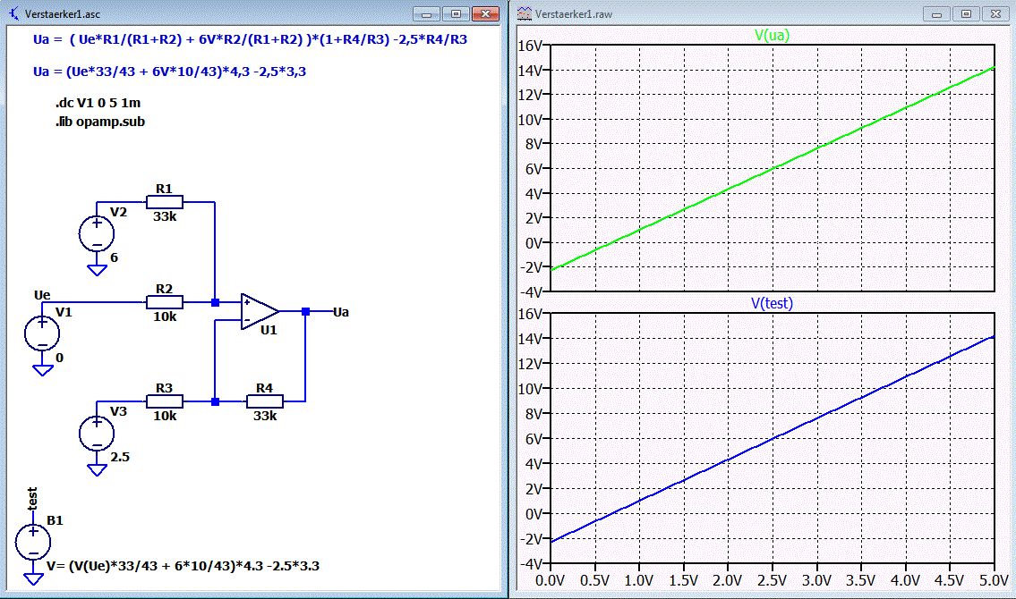 Am schnellsten erstellt man die Formel mittels Überlagerung. Ua = ( Ue*R17/(R17+R14) + 6V*R14/(R17+R14) )*(1+R15/R16) -2,5V*R15/R16 Bei Ue=680mV ist Ua ca. 0V. Bei Ue=2,2V ist Ua ca. 5V. Im Anhang die Simulation mit LTspiceXVII. Natürlich kann man nur dann eine negative Ausgangsspannung erhalten, wenn man eine negative Versorgungsspannung hat.