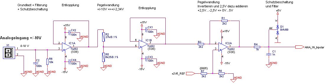 Hallo, ich möchte eine Analogspannung von -10V...+10V mit einem Prozessor einlesen. Hierzu muß die Spannung auf Pegel von 0V...+5V gewandelt werden. 0V am Eingang muß hierbei 2,5V am Prozessor entsprechen. Das heißt die Spannung wird auf ca. -2,5V...+2,5V runter geteilt und mit einem Offset von 2,5V nach oben geschoben. Ich habe mir eine Schaltung ausgedacht, die auch soweit funktioniert. Aber die hat den Nachteil, daß man 3 OP´s benötigt (siehe angehängte Datei). So was geht doch sicherlich auch irgend wie einfacher. Muß aber trotzdem relativ genau sein (möglichst keiner Fehler bei der Pegelanpassung)...