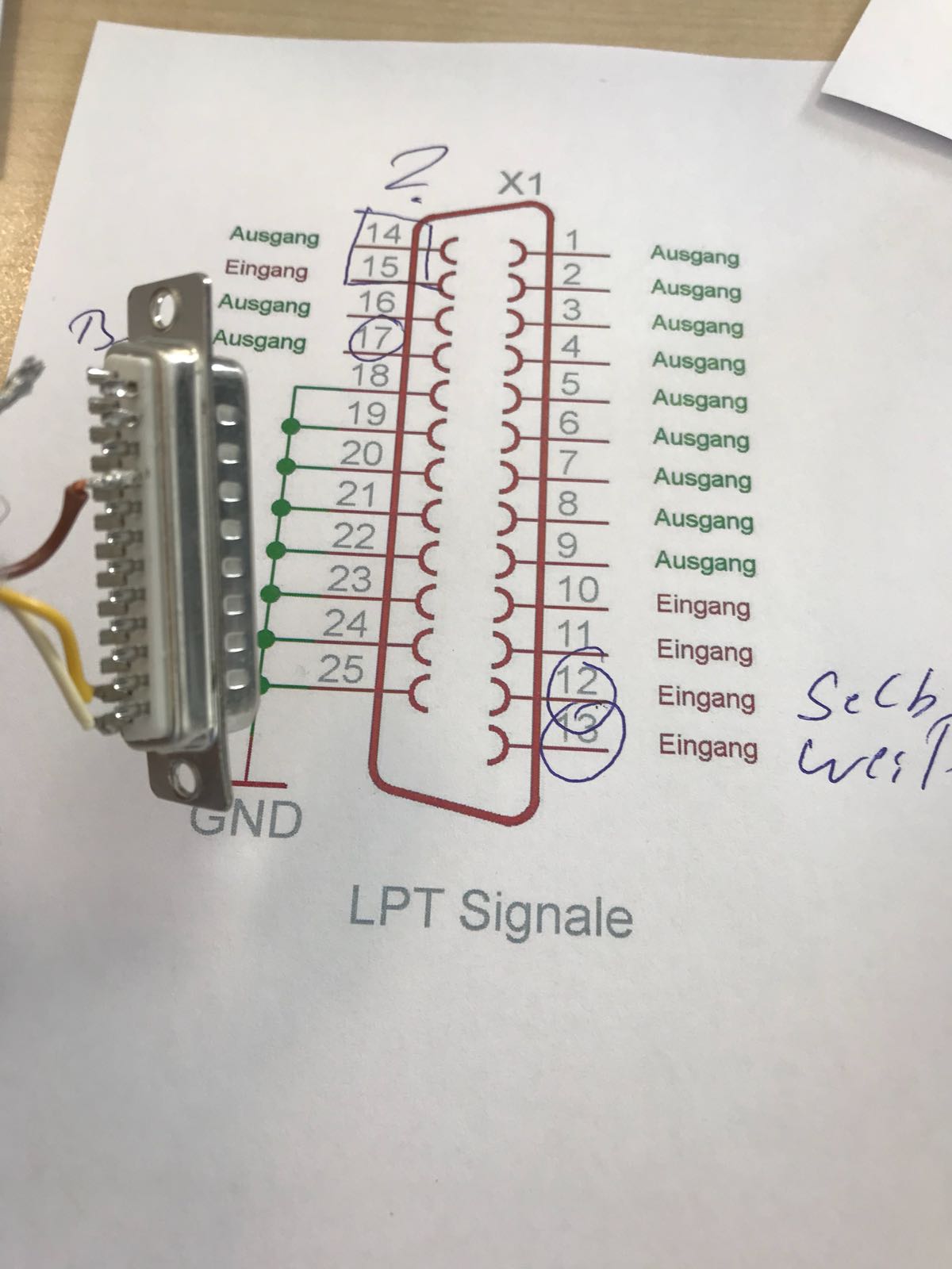 Wenn die zwei Taster an den verbliebenen 3 Leitungen angeschlossen sind, kann das "Massekabel" ja nur eine abschirmende Funktion haben. Da würde man doch annehmen, dass es an einen der Pins von 18 bis 25 gehört? Vielleicht war es auch per kalter Lötstelle am Gehäuse des Steckers befestigt?